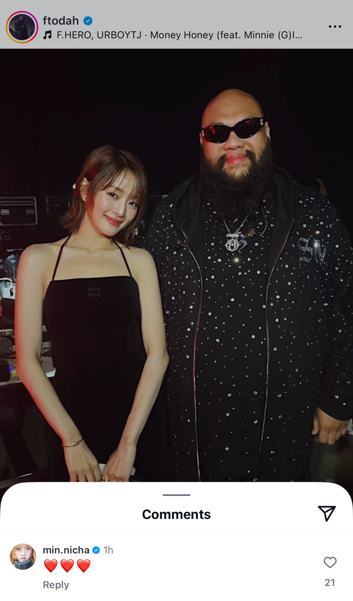 พี่กอล์ฟ ชวนมินนี่มา feat. เพลง MONEY HONEY กับ UrboyTJ ช่วงที่น้องมาจ๋องอยู่ที่ไทยตอนที่วงกำลังพักงาน ตอนนั้นกระแสตอบรับดีมากๆ เหมือนเป็นงานแรกเลยที่น้องได้ทำในไทยแบบจริงจัง (แล้วพี่กอล์ฟใช้เพลงนี้ใน post ด้วย น่าร้าก)