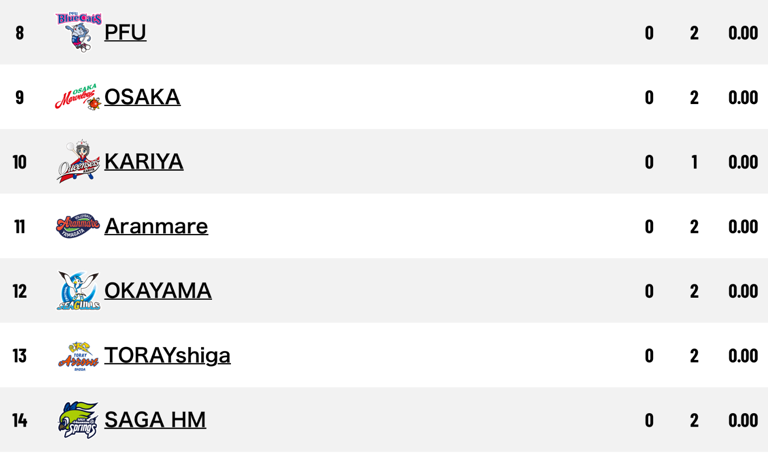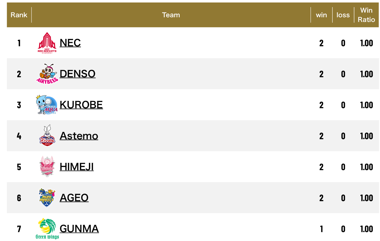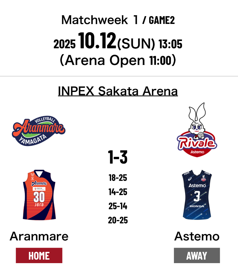 1.Aranmare Yamagata 1-3 Astemo Rivale Ibaraki (18-25 14-25 25-14 20-25) (77-89)
