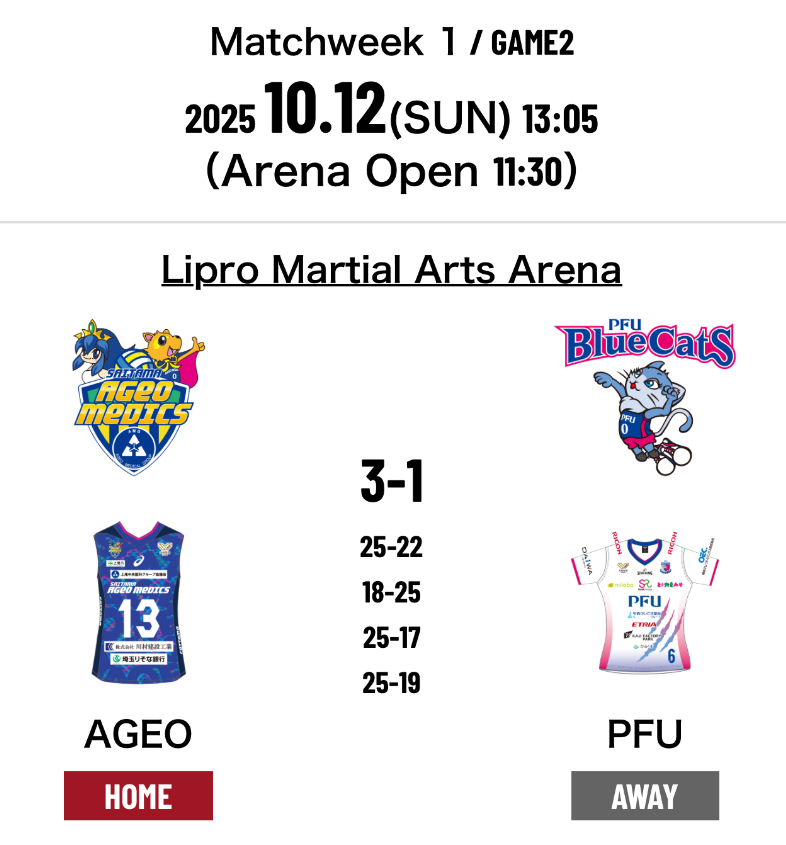3.Saitama Ageo Medics 3-1 PFU Blue Cats (25-22 18-25 25-17 25-19) (93-73)