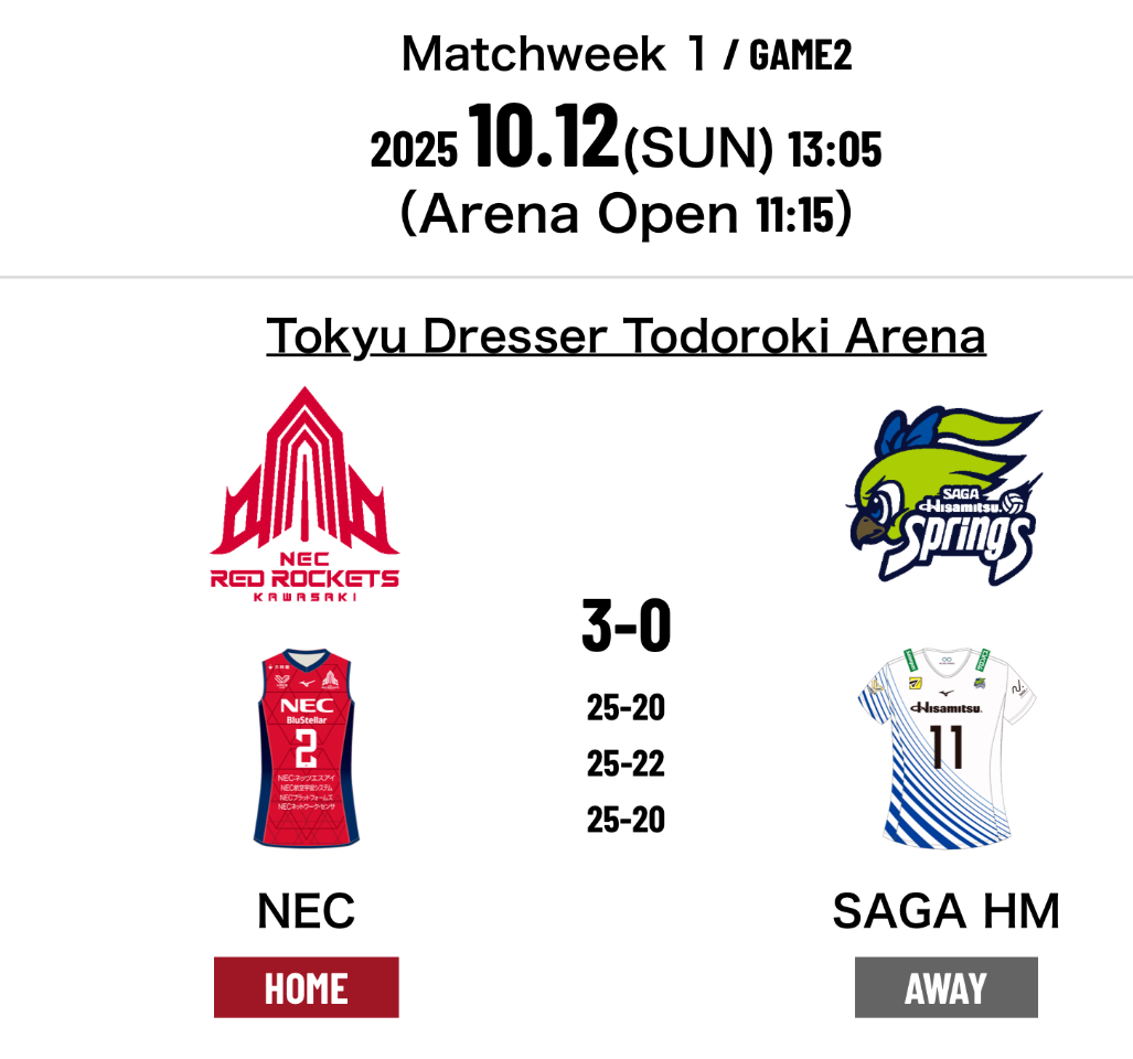 4.NEC Red Rockets Kawasaki 3-0 SAGA Hisamitsu Springs (25-20 25-22 25-20) (75-62)