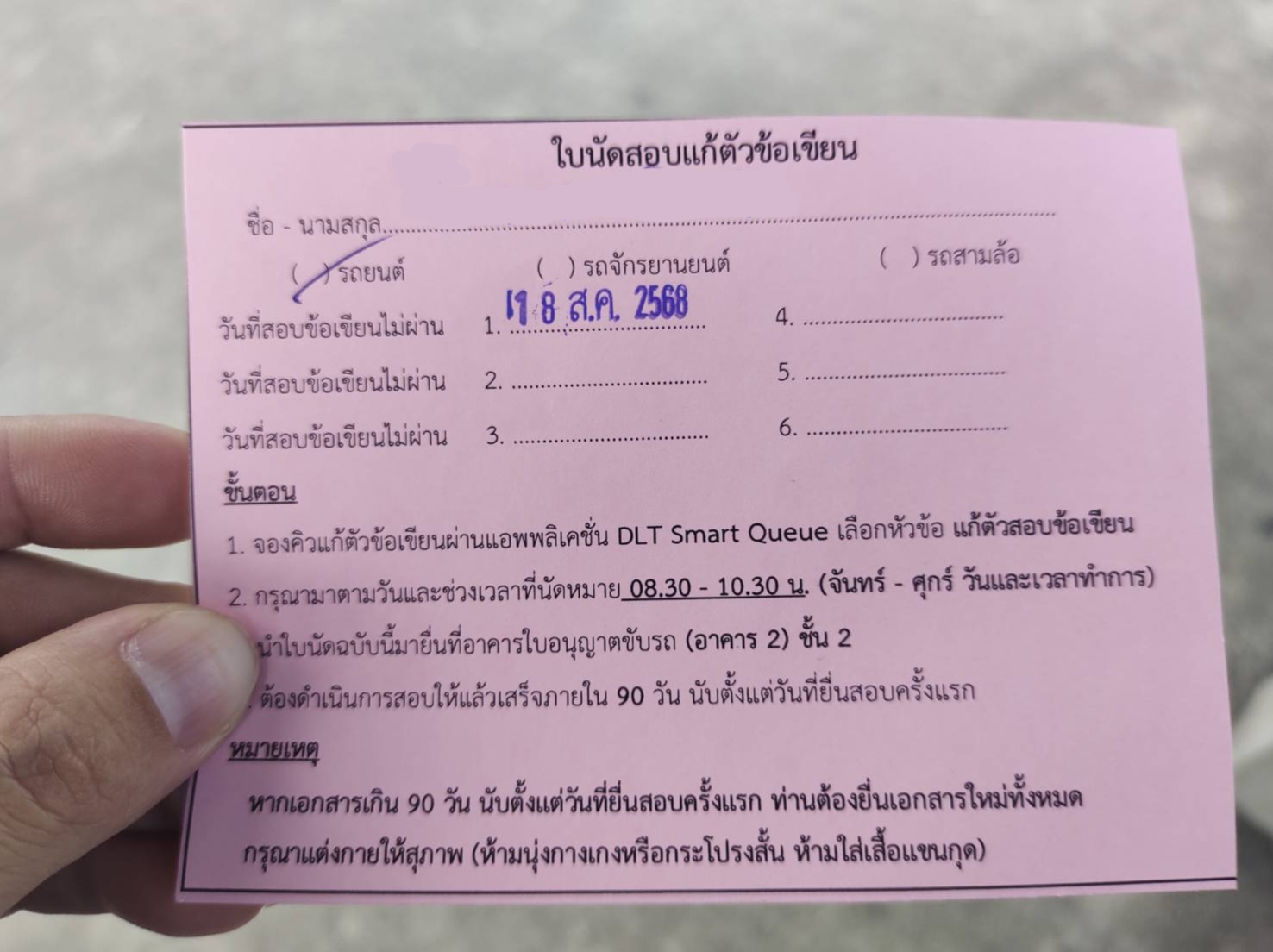 เจ้าหน้าที่ยื่นใบนัดสีชมพูมา ให้มาอบรมในวันที่นี้นะ (18/8/68) ไม่งั้นจะถูกตัดสิทธิ์ทั้งหมด ต้องไปสอบขับขี่รถ เริ่มใหม่หมดเลย