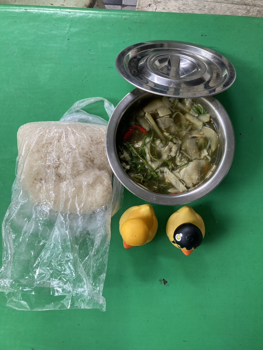 ที่ไหนได้ ตากหมูยังไม่ทันไรเลย ฝนเทลงมา จังหวะเพื่อนบ้านให้แกงหน่อไม้ พร้อมข้าวเหนียวนึ่ง ถ่ายหม้อคืนให้เพื่อนบ้าน