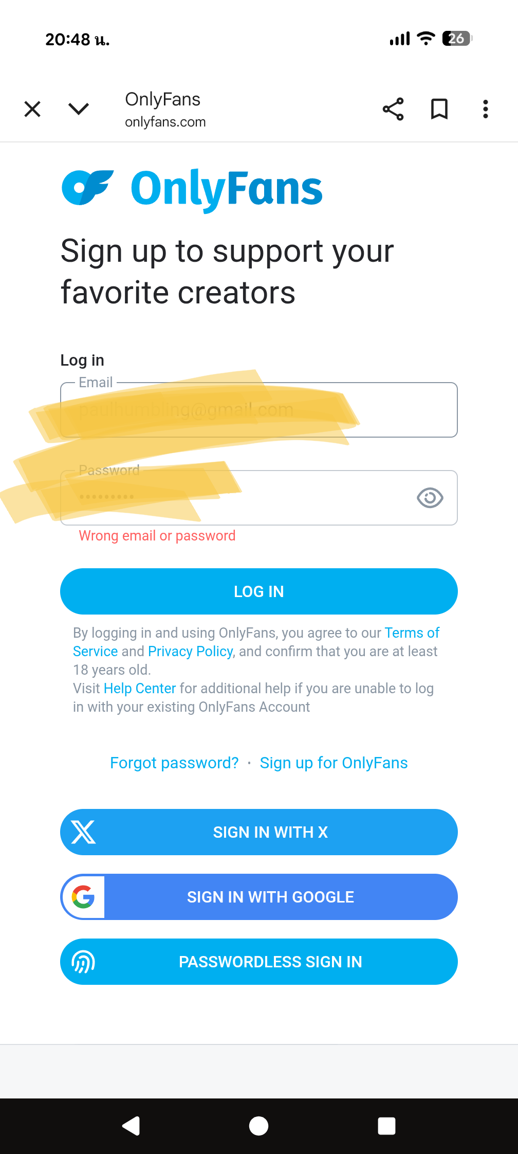 เวลาสมัคร onlyfans ด้วยอีเมลพอกด login แล้วเข้าไม่ได้ ขึ้นว่า wrong password ทั้งที่รหัสก็ผ่านทำไงครับผใ