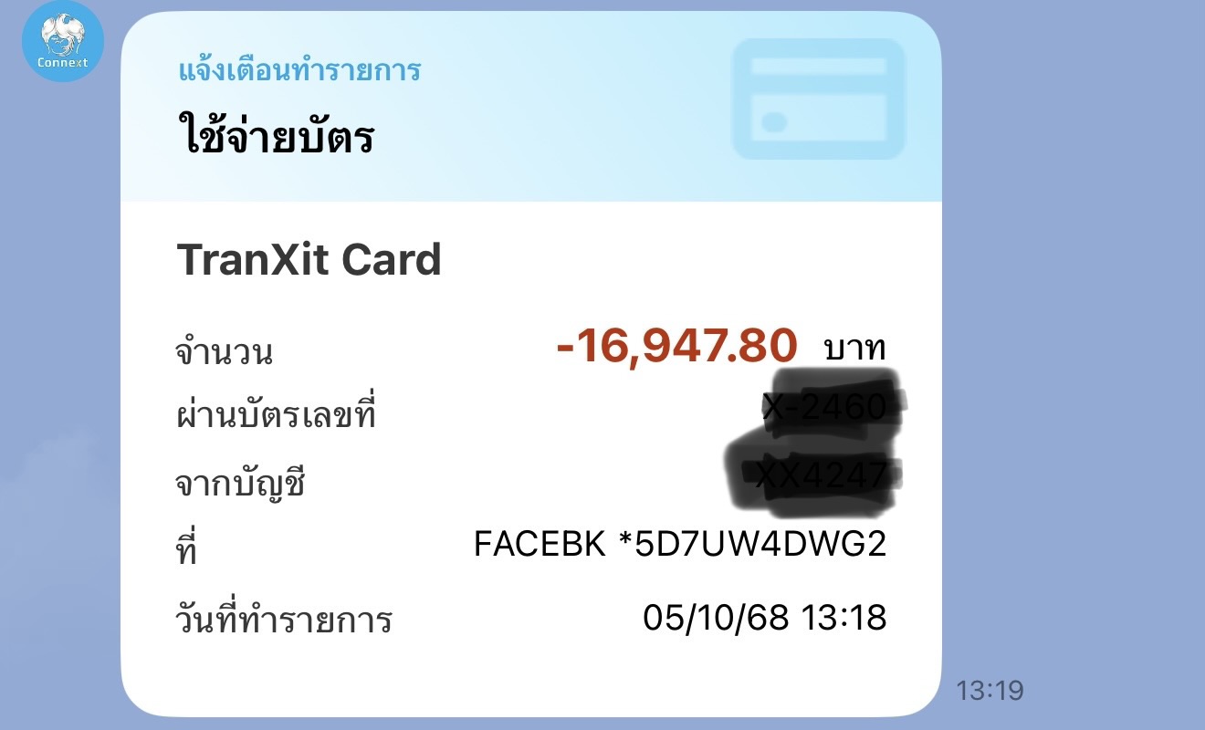 วันที่ 5/10/68 เวลา 13.18 จู่ๆ line กรุงไทย connext แจ้งเงินออกจำนวน 16,9947.80 ทำรายการจากบัตรเดบิต Tranxit card ละคืองงมากขับรถอยู่ บัตรก็อยู่กับตัว ไม่มีการแจ้งเตือนอะไรก่อนเลย ทั้ง sms OTP e-mail ไม่มีอะไรเลยอ่ะ ตกใจดิเงินออก แต่ต้องตั้งสติโทรหา call center ของกรุงไทยทันที ทางกรุงไทยก็อายัดบัตรให้ และถามว่าเราได้ผูกบัตรใช้จ่ายอะไรใน Facebook ไหม Recheck กับตัวเองแล้วก็ไม่เคยซื้ออะไรผ่าน Facebook เลย ในข้อมูล Facebook ไม่ยังไม่มีการเพิ่มบัตรอะไรไว้เลย ทางกรุงไทยบอกว่าเป็นการซื้อของผ่าน Facebook คราวนี้ให้ไปทำเรื่องกะธนาคารอีกที โดยให้เอาสมุดธนาคาร บัตรประชาชน บัตรเดบิตไปทำเรื่องปฏิเสธรายการกับทำบัตรใหม่ (ไม่อยากได้บัตรเลยจ้ะอยากได้เงินคืน) พอทำธุระอะไรเสร็จ เวลาประมาณ 16.00 ไปธนาคารกรุงไทยในโลตัส กดคิวธนาคารรอ ระหว่างรอเลยไป สน. แจ้งความ ยืนยันอีกทางว่าเราไม่ได้มีการผูกบัตรใดใด แจ้งความเสร็จ ก็กลับไปธนาคาร 17.15 น. ได้เล่าเรื่องรายละเอียดอีดที พร้อมใบแจ้งความ สมุดบัญชี บัตรเดบิต บัตรประชาชน ก็โดนถามคำถามเดิม บอกให้รอการปฏิเสธรายการ รอการตรวจสอบใช้เวลา 52 วัน OMG!!! เอาจริงๆนะใช้ผลิตภัณฑ์กรุงไทยมาโดยตลอดนะ แต่รอบนี้ทำให้ไม่อยากใช้เลยแต่มันคือบัญชีเงินเดือน เรารู้สึกว่าอะไรว่ะเนี่ยยย เงินไม่ได้ใช้ ระบบธนาคารไม่มีการแจ้งเตือนอะไรให้ลูกค้าเลยเหรอ เซง ตอนนี้ผ่านมาอาทิตย์นึงละยังไม่มีการติดต่ออะไรมาเลยจากธนาคาร มีแต่ตัวเราเองที่ร้อนใจ โทรไปติดตามเรื่อง เงินไม่น้อยนะ ทำเราเดือดร้อน ธนาคารให้แค่รอ