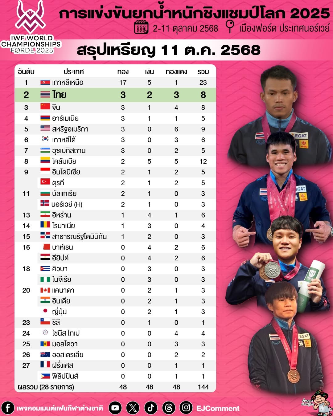 ตารางเหรียญรางวัลรายการยกน้ำหนักชิงแชมป์โลกปี 2025 ที่เมือง Forde ประเทศนอร์เวย์ ! 🏋️♂️🇰🇵😅
