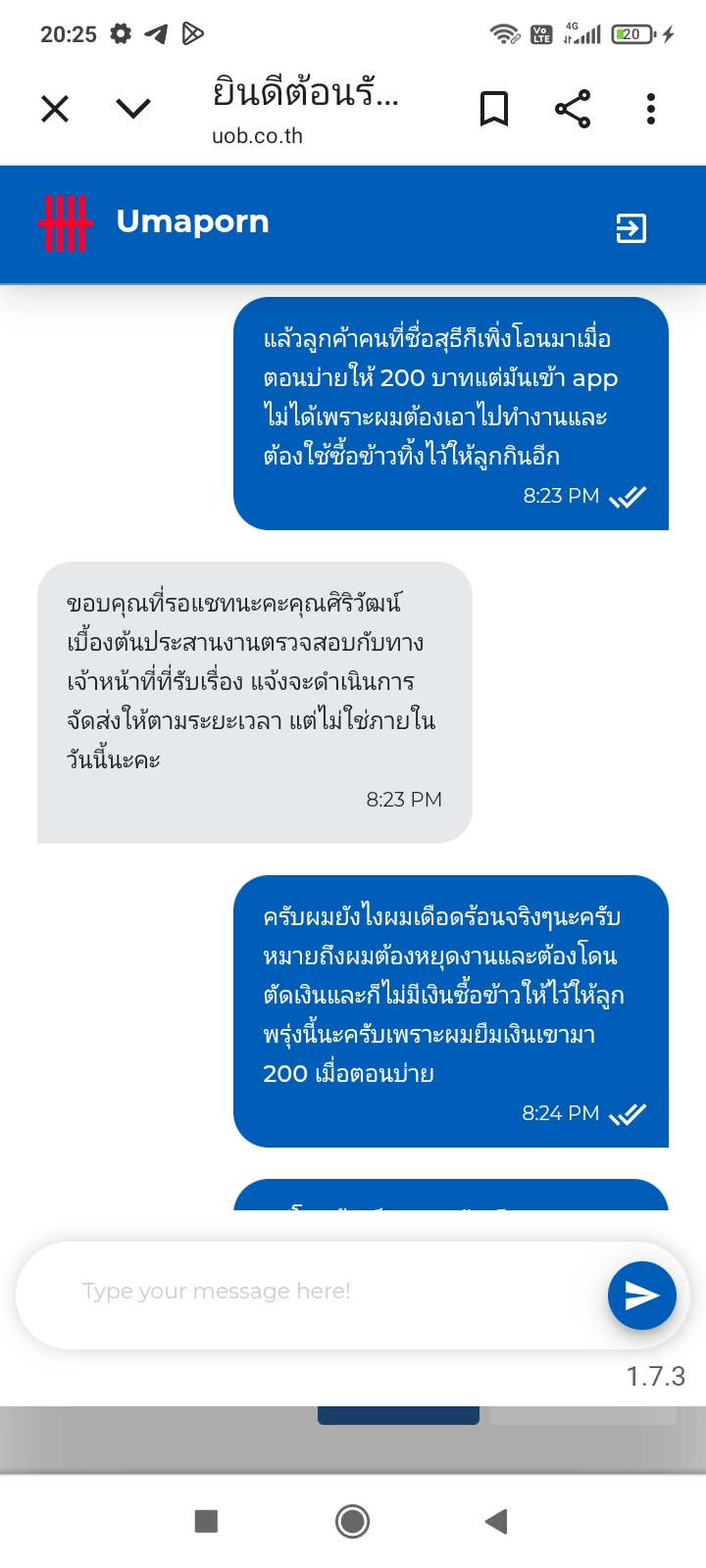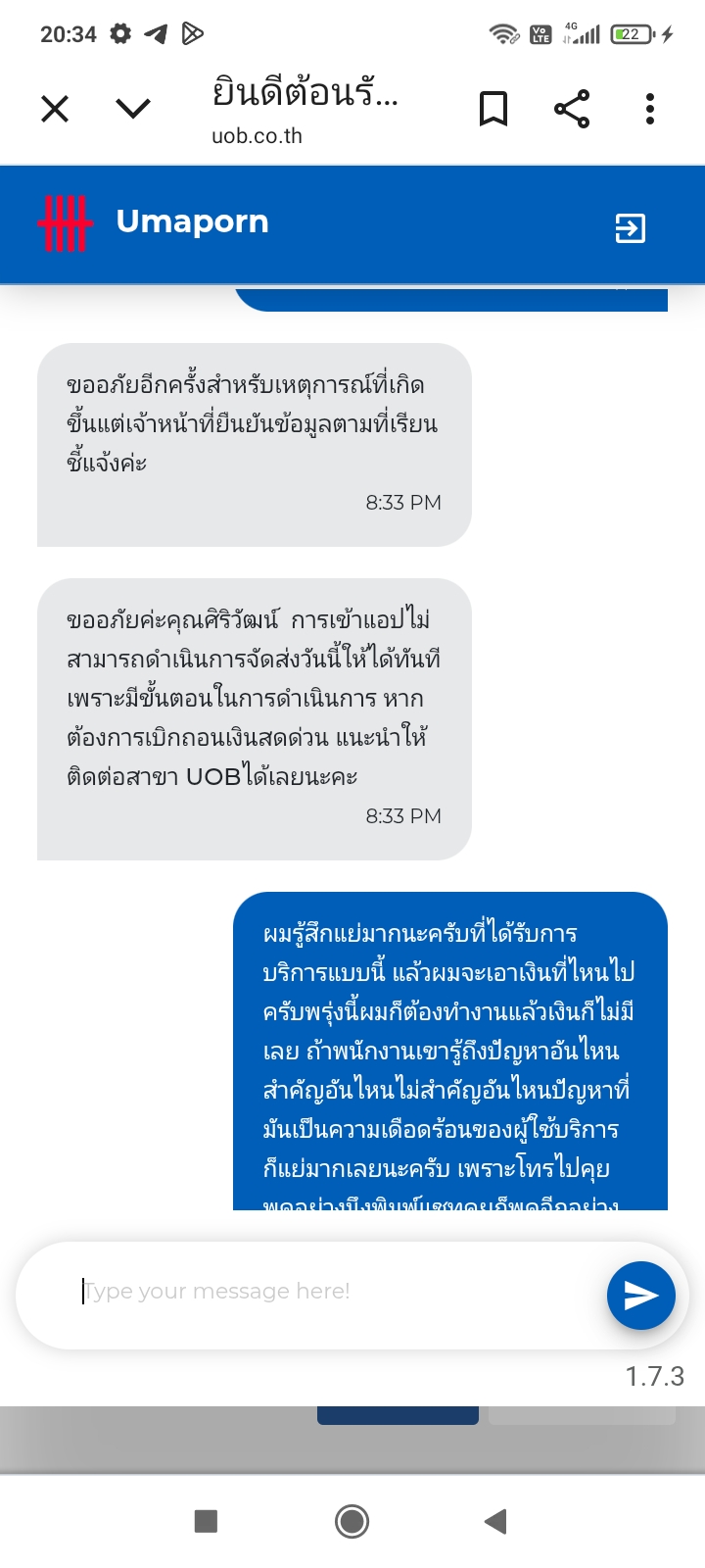 วันนี้เสียความรู้สึกกับ UOB มากไม่รู้ถึงความเดือดร้อนผู้ใช้บริการเเข้าใช้งาน application ไม่ได้เพราะรีเซ็ตโทรศัพท์แล้วเราใส่ username และ password เราจำได้ว่ามันถูกต้องแต่มันขึ้นข้อผิดพลาด และบัตรเดบิตมันหายกับหมายเลข 16 หลักไม่ได้ แล้วเราก็มีเงินอยู่ในนั้นที่จะต้องไปทำงานพรุ่งนี้และก็จะให้ค่าข้าวลูกสาวแต่ทั้งแชททั้ง call center ไม่ได้ช่วยอะไรตอบส่งผ่านๆเพื่อให้จบสาย และธนาคารอื่นใส่แค่รหัส 6 หลักมันก็สามารถเข้าใช้งานได้แล้วทุกธนาคารมีแต่ UOB ที่มีเงินอยู่ในนั้นไม่สามารถเข้าได้และเราขอความช่วยเหลือตั้งแต่ 3 โมงเย็นถึง 19:00 น. ไม่ได้รับความช่วยเหลืออะไรเลยมีแต่จะให้ไปสาขาและสาขามันอยู่ไกลมากเราเสียความรู้สึกมากกับ UOB คิดผิดที่ใช้บริการไม่รู้ถึงความเดือดร้อนทั้งๆที่เครื่องโทรศัพท์ก็เคยใช้เครื่องเก่าอีเมลเราก็มียืนยันตัวตนหน้าที่สแกนก็เป็นหน้าเรา otp ก็เป็นเบอร์เราและเราก็กดลืมรหัสผ่านแต่ไม่สามารถใช้งานได้เลยเราคิดผิดมากที่เอาเงินไปไว้ในตรงนั้นมีแต่ข้ออ้างว่าเป็นความปลอดภัยของลูกค้าซึ่งผมว่ามันไม่ใช่ความปลอดภัยความไม่ปลอดภัยคือระบบของคุณมากกว่าที่ทำให้ผมเป็นอย่างนี้ธนาคารยูโอบีเป็นอะไรที่ผมเสียความรู้สึกมากที่สุดและจะแข่งตลอดไป และ call center ก็หลอกอีกว่าเดี๋ยวจะส่งอีเมลมาให้เพื่อให้ล็อกอินเข้าใช้งานได้และยืนยันตัวตนทางอีเมลก็ไม่ได้ส่งไม่ได้สนใจวันนี้เราก็รอทางแชทของ UOB ก็หลอกอีกเดี๋ยวจะส่งให้ภายในวันนี้ก็ไม่ได้ส่งไม่สนใจคุณจะเอาการยืนยันตัวตนแบบไหนอีก video call มาดูหน้าเลยไหมอีเมลผมก็ตรงหมายเลขศาลหลักก็ตรงบัตรประชาชนก็มี otp ก็เบอร์ผมโทรศัพท์ของผมก็เคยใช้ app อยู่แต่แค่รีเซ็ตเพราะข้อมูลมันเต็มเป็นบริการที่แย่มากที่เคยได้รับรู้จากการใช้งาน app ธนาคารผมเคยได้รับผลกระทบแบบนี้จากอีกธนาคารนึงภายใน 5 นาทีผมยืนยันตัวตนผ่านอีเมลที่เขาส่งมาเพื่อช่วยเหลือได้แต่ธนาคารนี้ไม่ได้อะไรเลยจะให้ไปสาขาอย่างเดียวก็แค่ลืมรหัสผ่านเป็นระบบความปลอดภัยที่ไม่ปลอดภัยกับลูกค้าผมจะจดจำ application นี้ธนาคารนี้ไปจนวันตายซึ่งทำให้ลูกผมเดือดร้อนและผมเดือดร้อนจำเป็นจะต้องหยุดงานเป็น application และธนาคารที่เห็นแก่ตัว ไม่รู้ถึงความเดือดร้อนของลูกค้าในตอนนั้นถ้าเวรกรรมมีจริงขอให้คุณเจอสิ่งแบบนี้บ้าง ค่าใช้จ่ายในวันพรุ่งนี้และตอนนี้มันอยู่ในนั้นหมดเลยถ้าผมรู้ว่าเป็นอย่างนี้ผมไม่ใช้บริการเด็ดขาด ธนาคาร UOB เป็นอะไรที่แย่ที่สุด มีแต่ตอบส่งเดชว่าเดี๋ยวส่งอีเมลมาแล้วก็รีบๆจบพอคุยไปคุยมาก็ตัดบทให้ไปที่สาขาแล้วไม่มี c