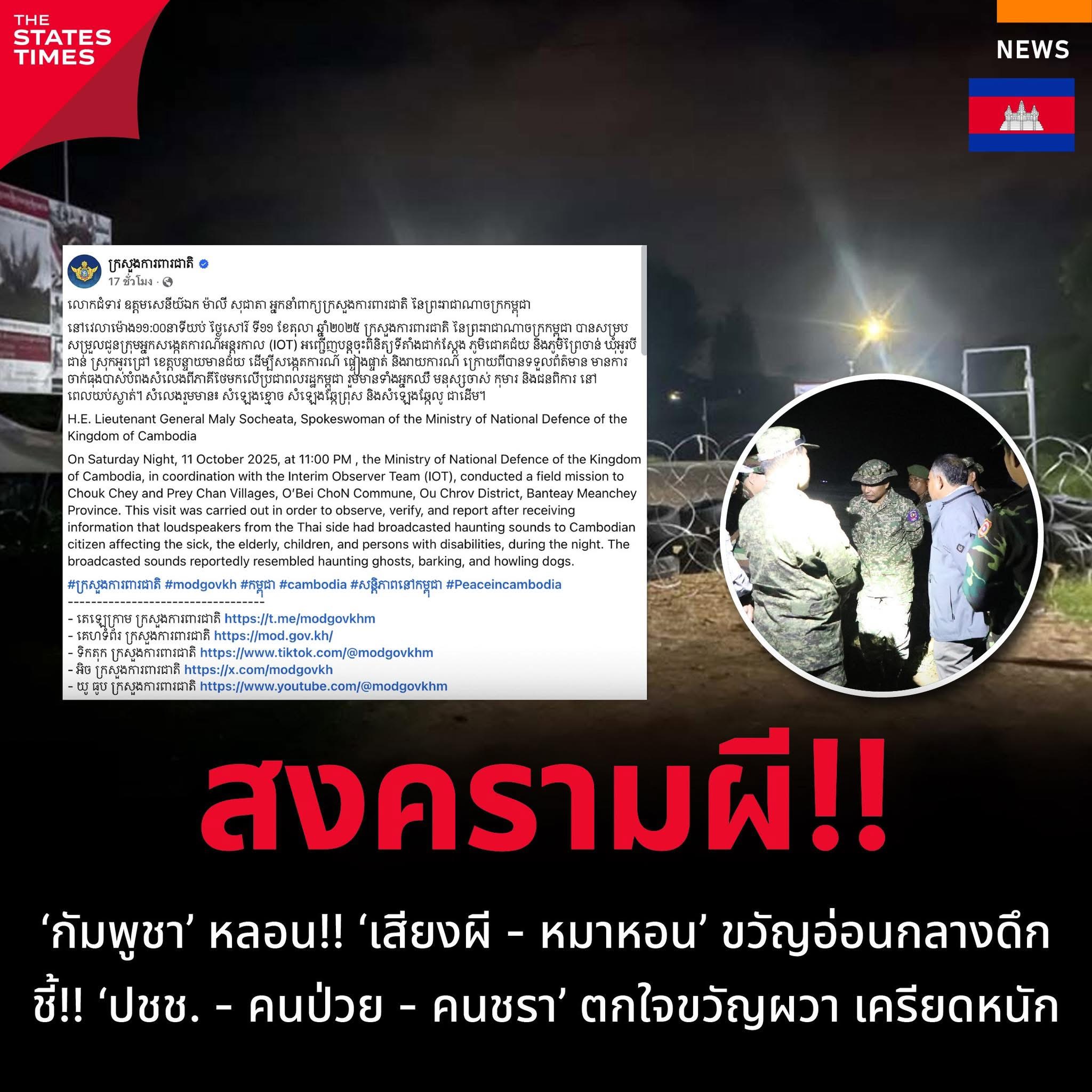 เปิดเผยว่า กระทรวงกลาโหมกัมพูชาได้ประสานคณะผู้สังเกตการณ์ชั่วคราว ( IOT) ลงพื้นที่หมู่บ้านซุกค์ และหมู่บ้านเปรยจันของจังหวัดบันเตียเมียนเจย เพื่อสังเกตการณ์ ตรวจสอบ และรายงาน หลังจากได้รับข้อมูลว่ามีลำโพงเสียงดังคล้ายเสียงผี เสียงหมาเห่า และเสียงหอน จากฝั่งไทย ทำให้ชาวกัมพูชา โดยเฉพาะคนป่วย คนชรา เด็กและผู้พิการ ได้รับผลกระทบ แต่ยังสงบนิ่งกับเสียงดังกล่าว