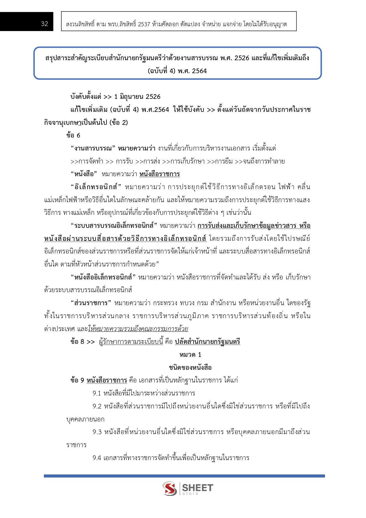 - แนวข้อสอบสรุปสาระสำคัญระเบียบสำนักนายกรัฐมนตรีว่าด้วยงานสารบรรณ พ.ศ. 2526 และที่แก้ไขเพิ่มเติมถึง (ฉบับที่ 4) พ.ศ. 2564