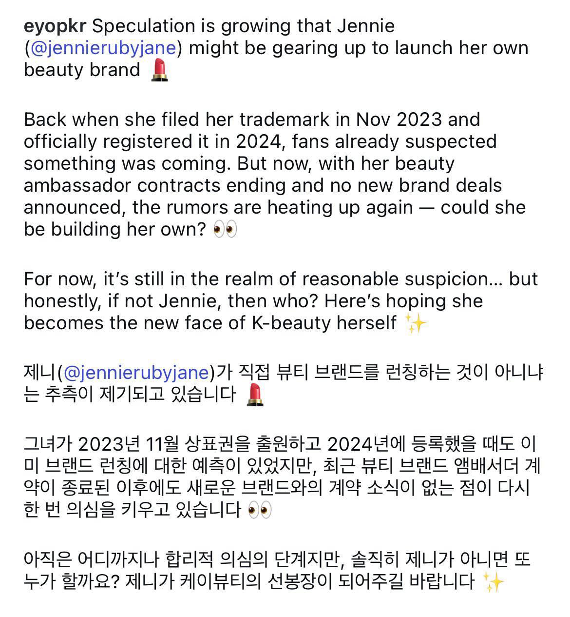 eyopkr : มีการคาดเดาว่าเจนนี่กำลังจะเปิดตัวแบรนด์ความงามของตัวเอง 👀