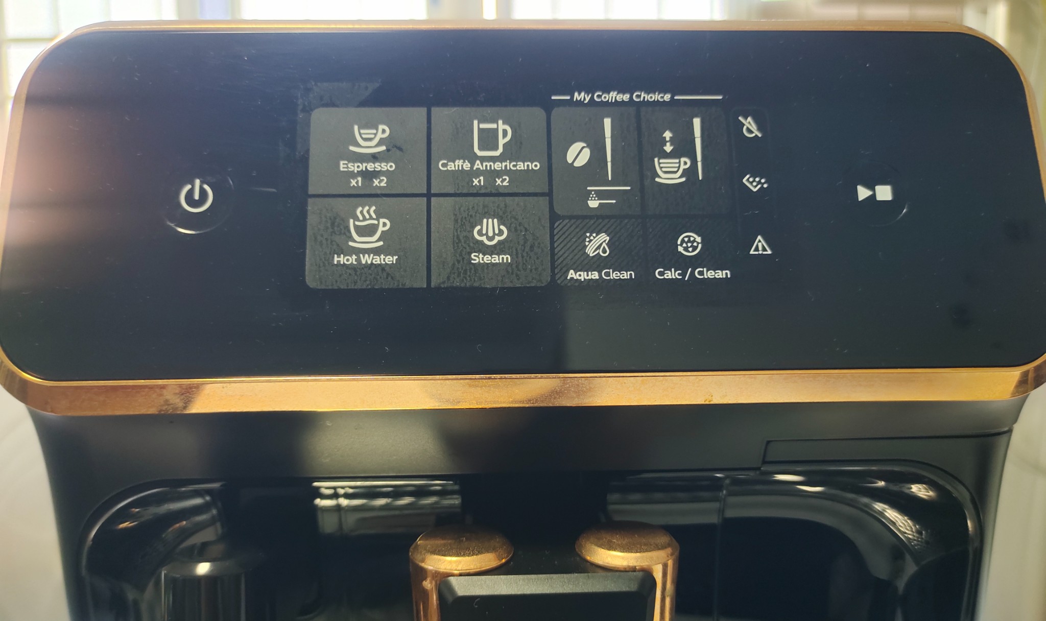👉🏻 แผงหน้าจอ :: มีปุ่มเมนูที่เราต้องการจะทำ Espresso , Americano , Hot water (น้ำร้อนเพียงอย่างเดียว) , Steam (ทำฟองนม)