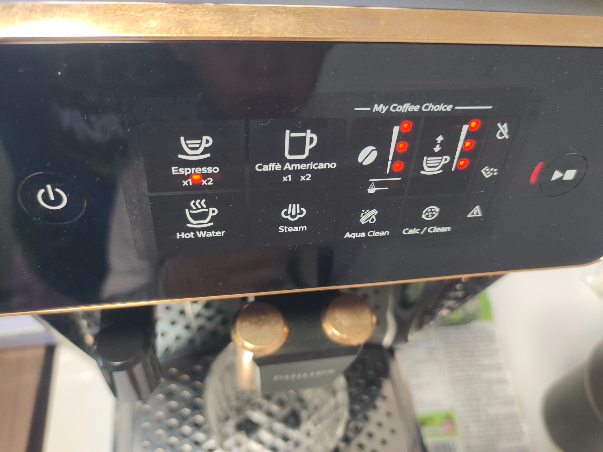 พอไฟหยุดนิ่งแล้ว เราอยากทำเมนูอะไรก็เลือกได้เลยค่ะ เราเลือกเป็น "เอสเปรสโซ่" เมนูประจำของเราค่ะ เมื่อเลือกแล้ว ไฟจะติดที่เมนูที่เราเลือกค่ะ จากนั้น เลือกปริมาณของกาแฟ (กี่แก้ว) x1 หรือ x2 นอกจากนี้ เรายังสามารถเลือกปรับระดับความเข้มของกาแฟและเลือกปริมาณน้ำที่ออกมากับกาแฟได้ด้วยนะคะ สุดท้าย กดปุ่มทางด้านขวามือ เพื่อให้เครื่องทำงานได้เลยค่ะ