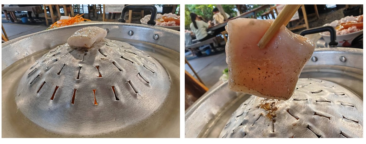 พร้อมกับคีบมันหมูที่ผ่านการป้ายกระทะขึ้นมาโชว์