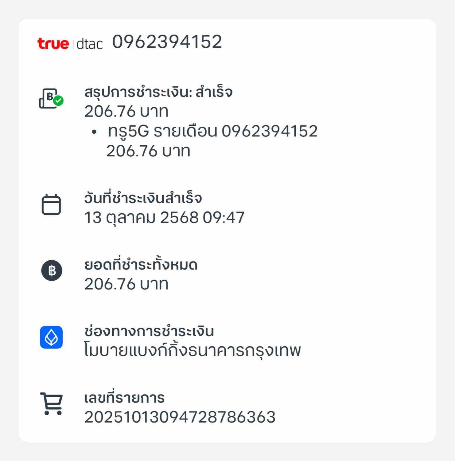 ผมใช้ซิมทรูที่ลวงท้ายด้วยหมายเลข 190 แบบรายเดือน มาตั้งแต่วันที่ 6 มิถุนายน 2567 ต่ออายุทุกเดือนตามกำหนด ไม่เคยมีปัญหา เดือนนี้ เมื่อได้รับแจ้ง ก็ชำระเวินไปตามระเบียบ และได้รับข้อความเหมือนอย่างปกต