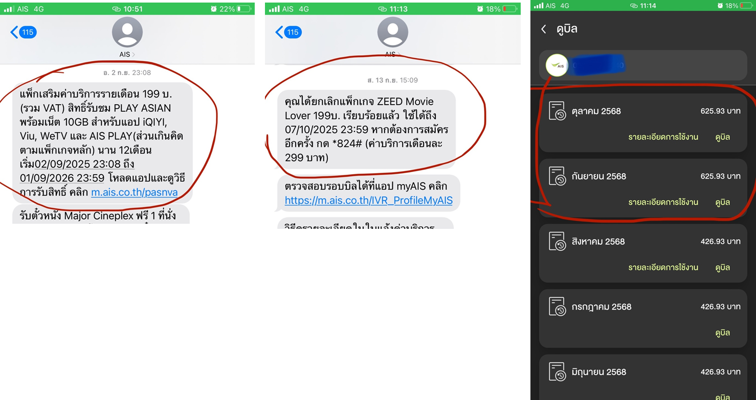 - ในแอป AIS มันบอกว่าเราสมัครแพกเกจ Zeed Movie Lover 199 บาท ซึ่งเราไม่เคยสมัคร