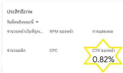พอกลับไปดูหน้าแรก ซึ่งมีวิดเก็ตชื่อ "ประสิทธิภาพ" สังเกตพบว่า CTR ของหน้า (ก็คือกระทู้ในขณะที่แสดงโฆษณา) สูงกว่า CTR ของโฆษณาในรูปแรกมาก ในรูปมากกว่าเป็นสิบเท่า