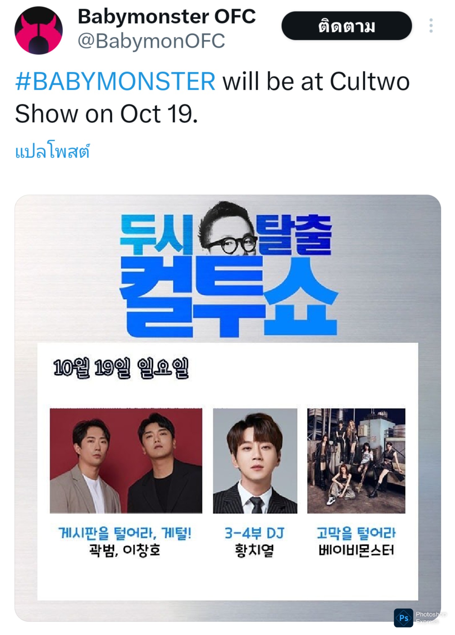 BABYMONSTER จะไปออกรายการวิทยุ Cultwo Show รายการวิทยุที่มีเรตติ้งอันดับ 1 ของเกาหลีในวันที่ 19 ตุลาคม 2025 นี้
