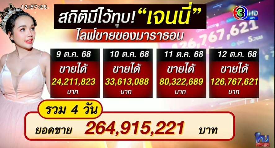 - เจนนี่ ได้หมดถ้าสดชื่น ไลฟ์สดขายของมาราธอน 4 วัน ทำยอดรวม “ทะลุ 263 ล้านบาท”