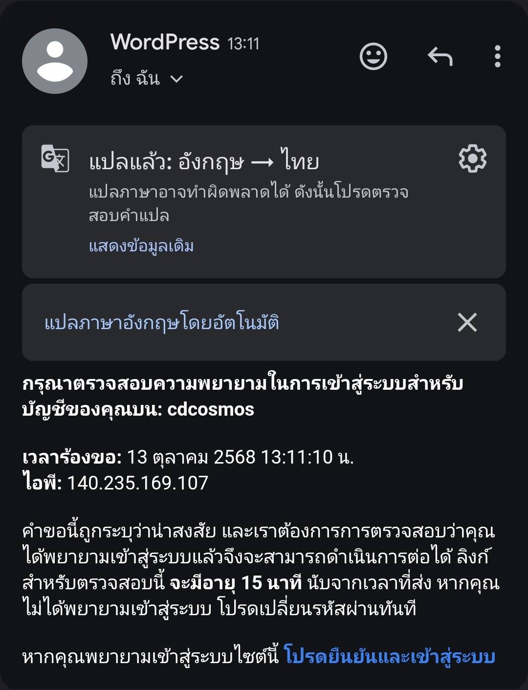 ผมถูกส่งมาตั้งแต่วันที่ 29 ต.ค. และอีกวันเขาก็ส่งมาอีกรอบ ซึ่งผมมารู้ตัวตอนวันที่ 1 พ.ย แต่ผมยังเห็นอีเมลนี้นะ ผมโดนแฮก ยูทูปผมโดนแบน และ จู่ๆก็ต่อ Netflix เอง ผมเลย ลบ G-mail ทั้งหมดและล้างเครื่อง ท