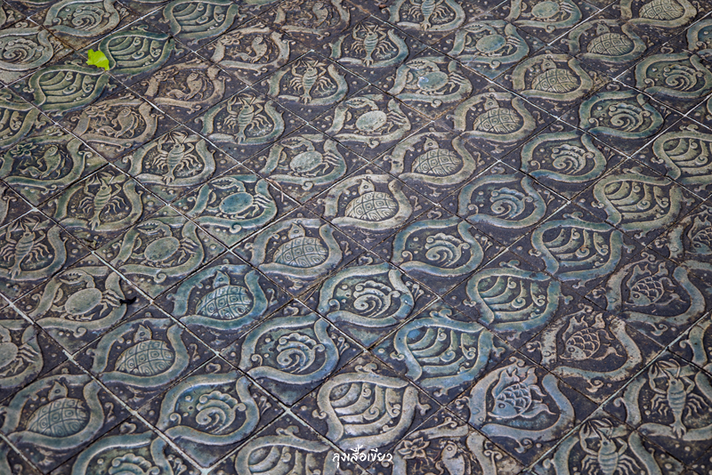 พื้นของรัตนเจดีย์ปูด้วยกระเบื้องที่มีลวดลายเป็นคลื่นน้ำ กุ้ง ปู ปลา เต่า สะท้อนถึงความอุดมสมบูรณ์ของธรรมชาติ ดูสวยงามเลยทีเดียวครับ