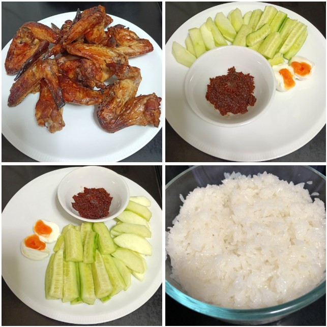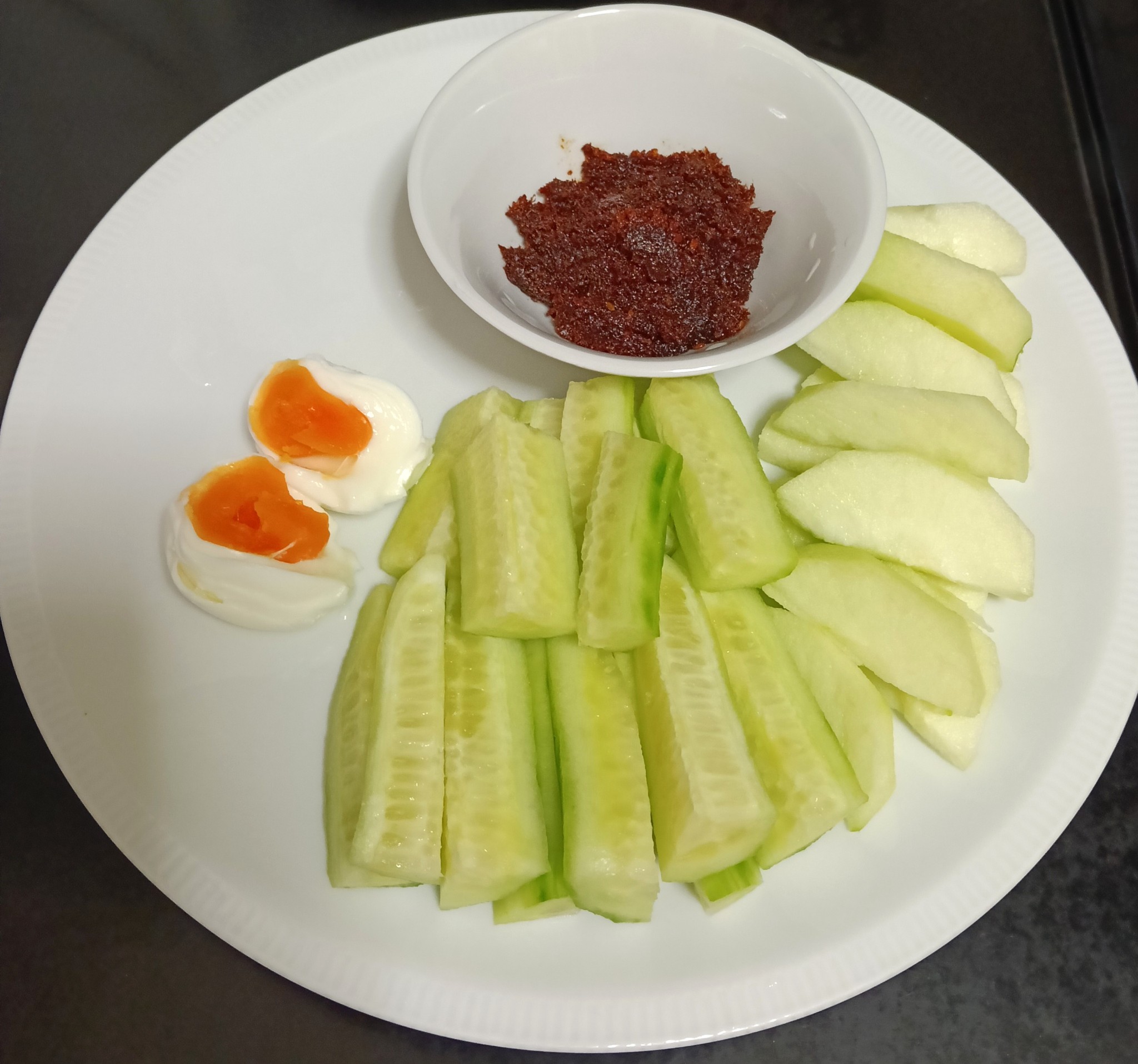 มื้อกลางวนในวันที่ WFH มีข้าวเหนียว น้ำพริกตาแดง แตงกวา แอปเปิ้ลเขียว ไข่ต้ม แล้วก็ไก่ย่างที่เหลือจากวันก่อนนิดหน่อย