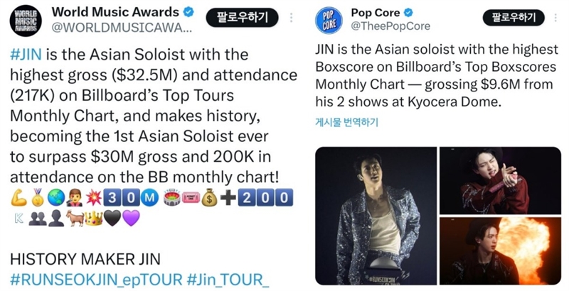 การแสดง “Run Seokjin Tour” ที่จัดขึ้นในวันที่ 12–13 กรกฎาคมที่ผ่านมา ทำรายได้สูงถึง 9.6 ล้านดอลลาร์สหรัฐ จากเพียง 2 รอบการแสดงเท่านั้น กลายเป็นสถิติใหม่ของ ศิลปินเดี่ยว K-pop ที่ทำรายได้สูงที่สุดจากคอนเสิร์ตในสถานที่เดียวกัน และเมื่อรวมกับทุกศิลปิน K-pop ทั้งหมด ถือเป็นอันดับที่ 2 ของการแสดงแบบกลุ่ม และ อันดับที่ 3 ของทุกคอนเสิร์ต K-pop ที่เคยจัดมา
