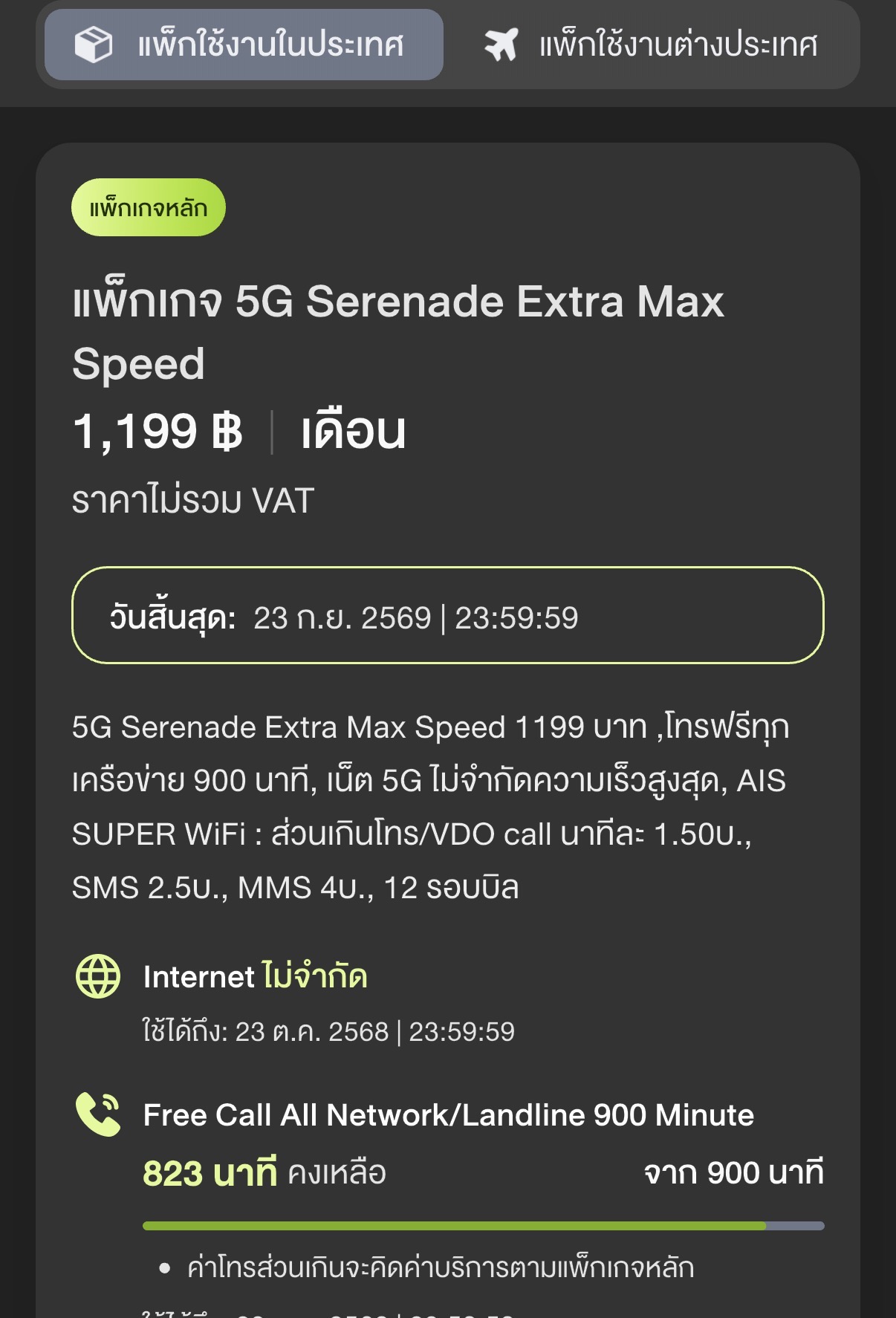 เหมา เหมา 250 บาท - ใช้งาน Internet 5G (เร็ว 1Gbps) 10GB จากนั้นเร็ว 15 Mbps เป็นจำนวน 70GB/เดือน หลังจากนั้นใช้งานได้ไม่จำกัด ที่ความเร็ว 384kbps - AIS SUPER WiFi ใช้งานได้ไม่จำกัด - โทรฟรีทุกเครือข่