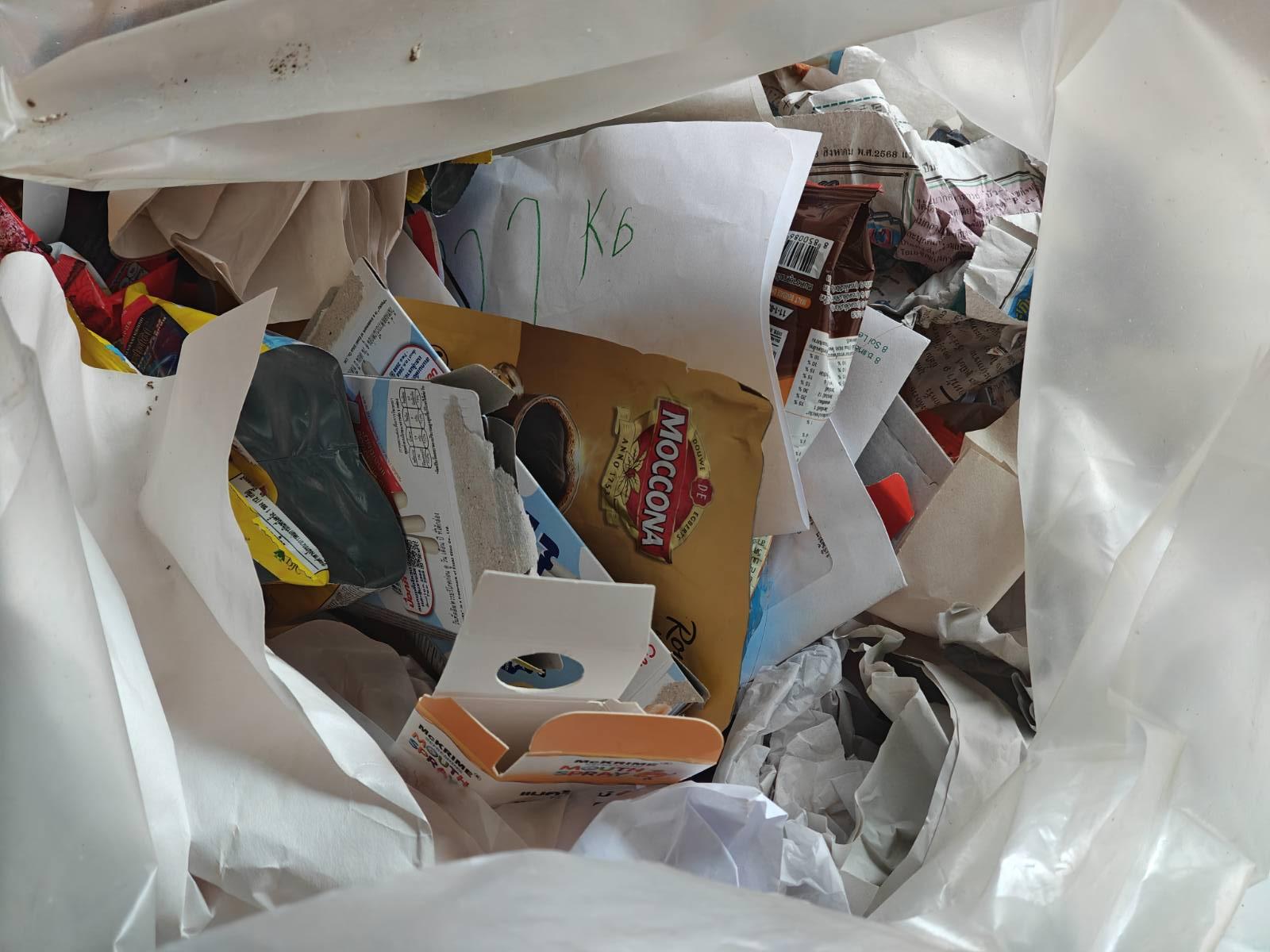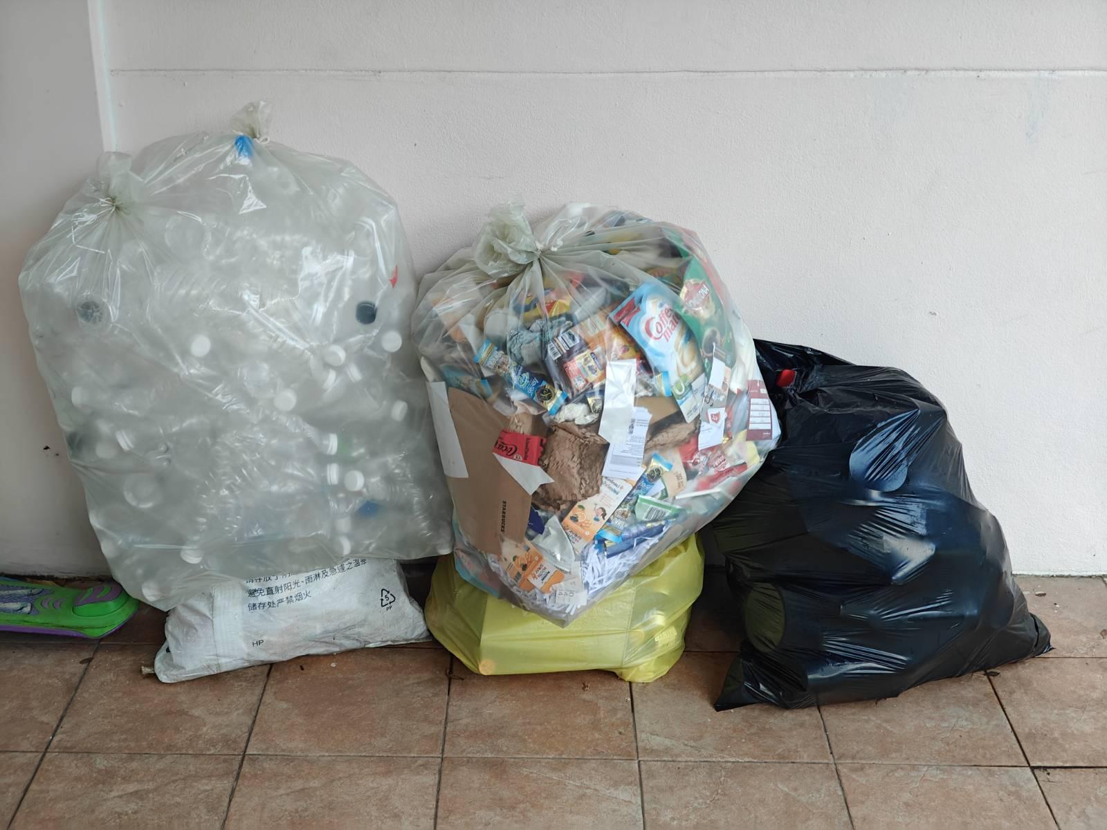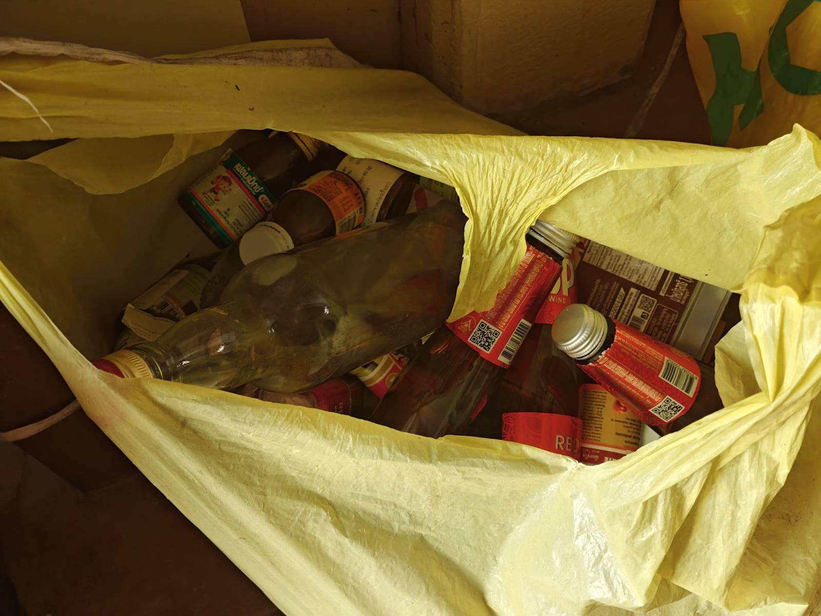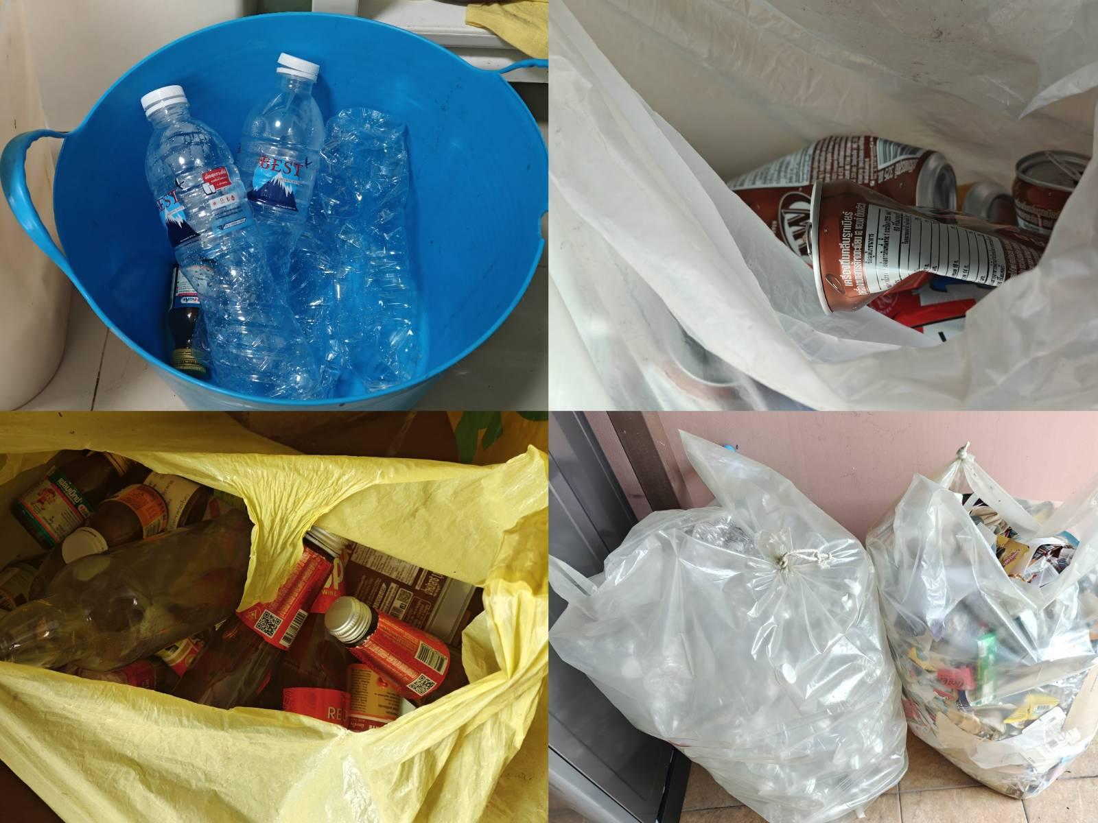 พอถังเก็บขยะรีไซเคิลในบ้านเริ่มเต็ม ก็จะทยอยเอามาเทแยกใส่ถุงเก็บไว้ แยกเป็นถุงใส่กระป๋อง ถุงใส่เศษกระดาษ ถุงใส่ขวดน้ำพลาสติก ขวดพลาสติกต่างๆ และถุงใส่ขวดแก้ว