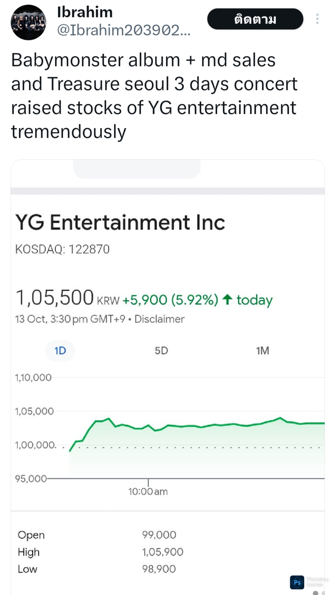 รายงานจากตลาดหลักทรัพย์เกาหลีขณะนี้ราคาหุ้น YG Ent.ทะลุ 100,000 วอนเป็นที่เรียบร้อยผลมาจาก BABYMONSTER และ TREASURE