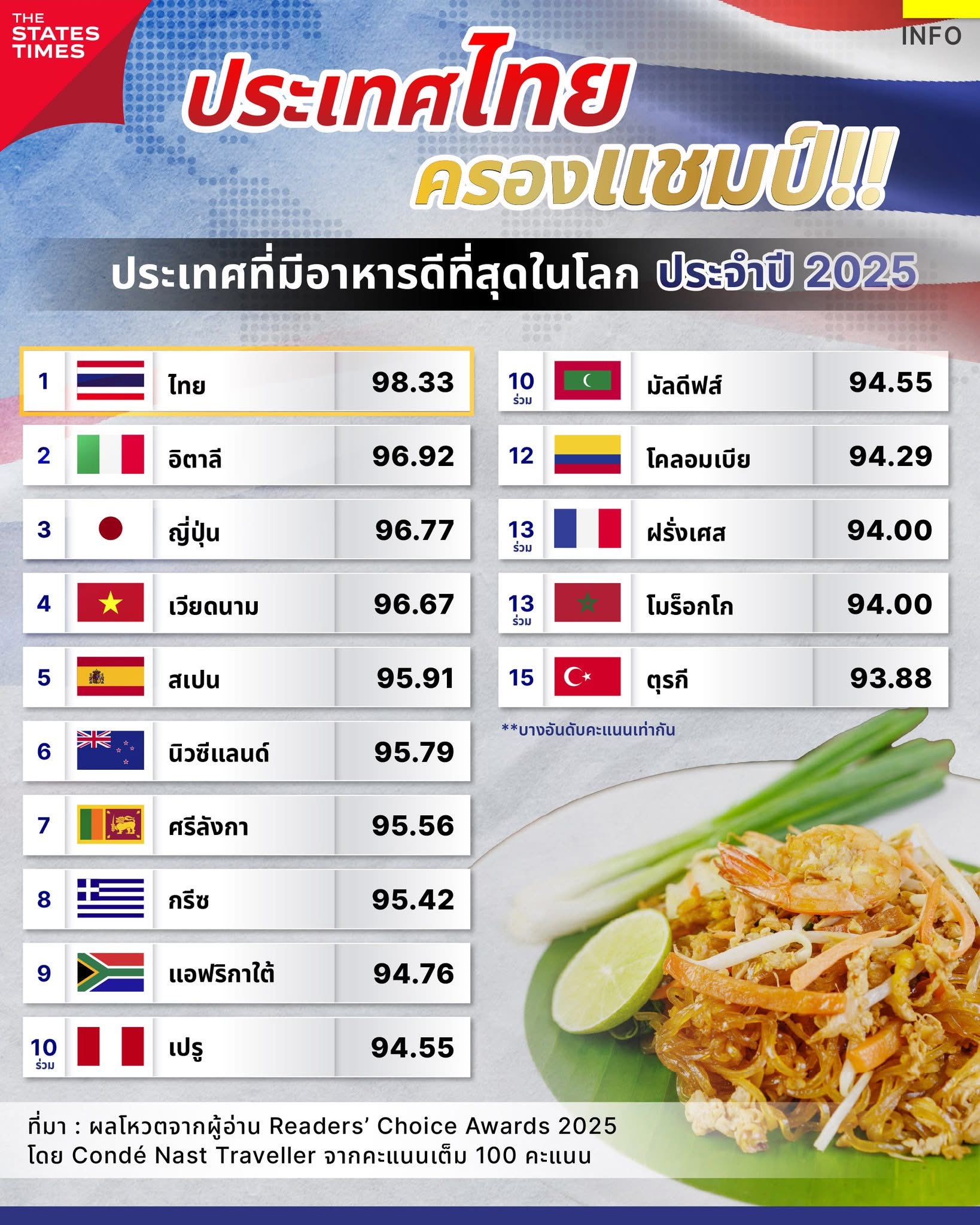 ไทยครองแชมป์ ‘ประเทศที่มีอาหารดีที่สุดในโลก’ ประจำปี 2025 ด้วยคะแนนสูงสุด 98.33