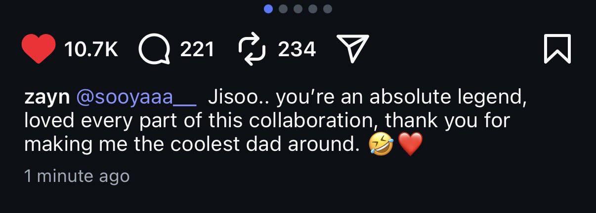 “จีซู...คุณเป็นตำนานจริงๆ ชอบทุกอย่างของการร่วมงานครั้งนี้ ขอบคุณที่ทำให้ฉันเป็นพ่อที่เจ๋งที่สุด 🤣❤️”