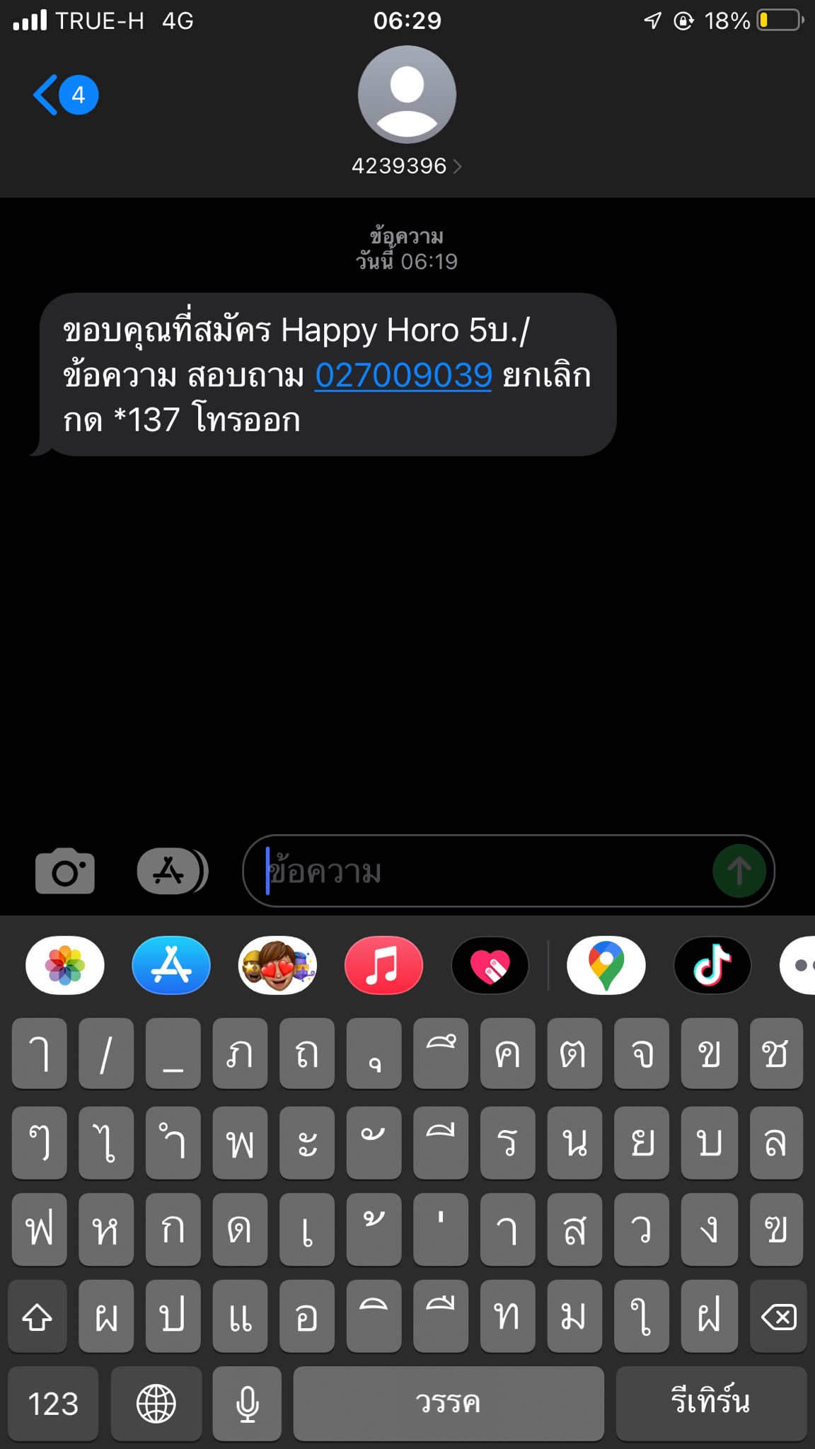 ในข้อความมีทั้ง Hit Horo และ Ruay_Horo เลยค่ะ ขึ้นมาเป็นข้อความว่า “ขอบคุณที่สมัคร Hit Horo 5บ./ข้อความ แล้วก็ยกเลิกกด *137 โทรออก” มีใครเคยโดนแบบนี้บ้างมั้ยคะ แล้วต้องทำอะไรยังไง งงค่ะ อย