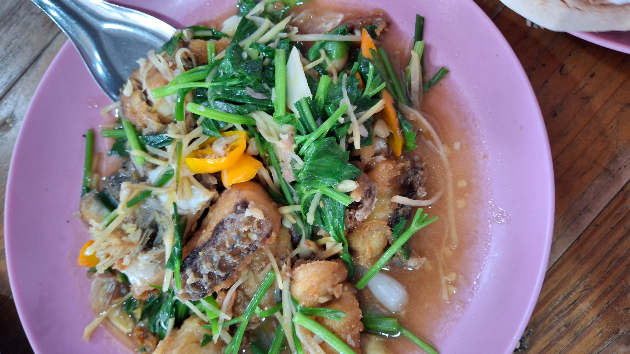 ผัดปลากระพง ถ้าใครชอบผัก ชอบสมุนไพร ถือว่าให้เยอะค่ะ ปลาชิ้นใหญ่พอดีคำ กรุบๆ กลิ่นหอม