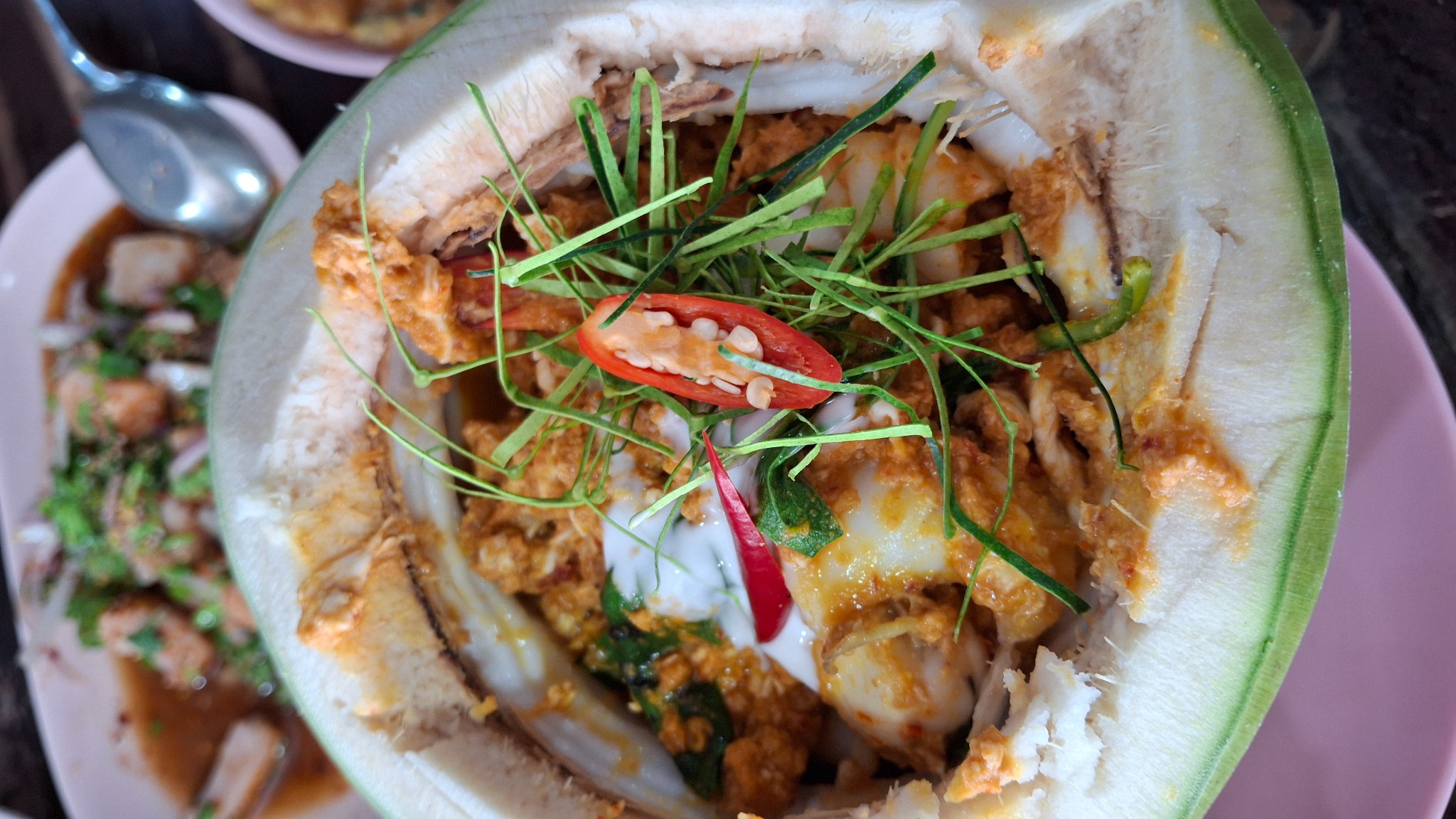 ห่อหมกทะเลลูกมะพร้าว 250.- ไม่ใช่มะพร้าวอ่อนนะคะ แต่ห่อหมกมาเต็มลูก เน้นกุ้งปลาหมึก ไม่เน้นเนื้อห่อหมก อร่อย ไม่เผ็ดไม่หวานมาก ลูกแรกใกล้หมด สั่งต่อลูก 2 รอเลยจ้า