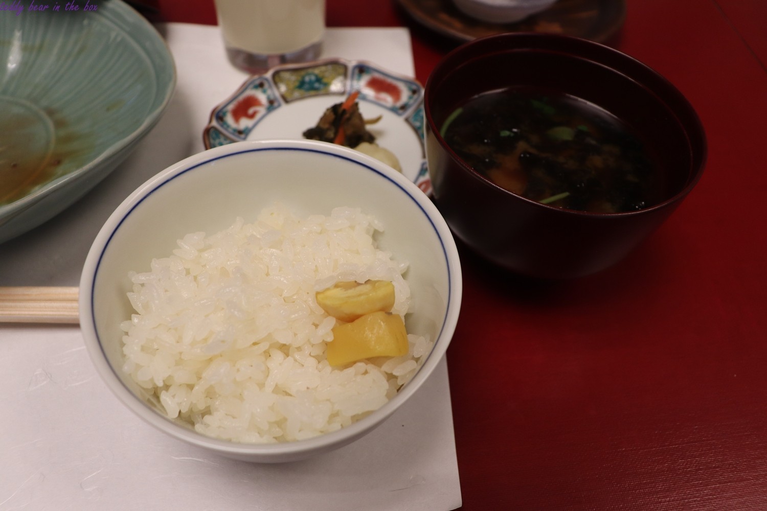 ข้าวหุงกับเกาลัด ผักดอง และซุปเต้าหู้ใส่สาหร่าย