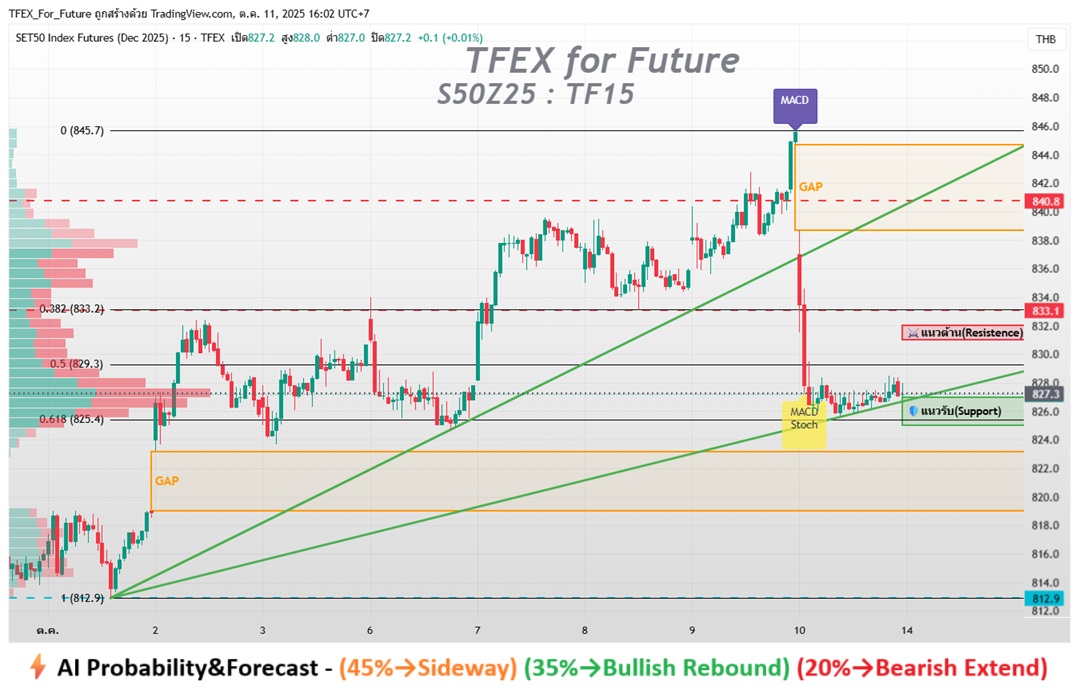 🔹 45% → Sideway 825–833 (พักฐานหลังลงแรง)