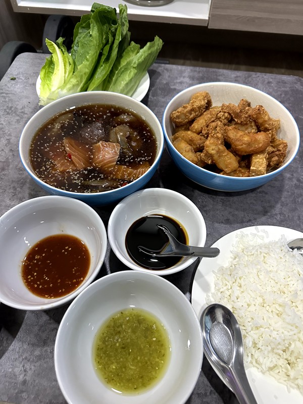 แซลมอนดอง + สามชั้นทอดน้ำปลา + ผักคอส
