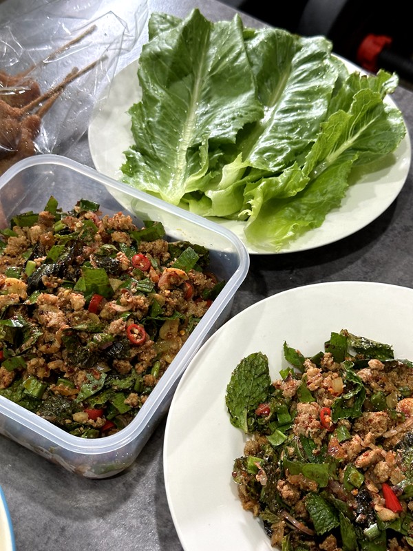 ร้าเจ้ผึ้ง ข้ามถนนเล็กๆ ก็ถึงทะเลแล้ว จานนี้ไข่เจียวปูแบบธรรมดาค่ะ มีแบบเนื้อก้อนด้วยนะ ลาบแซลม่อน แซ่บๆ จ้า ข้าวผัดปูจานกลาง 5 คน คือจุกๆ เกือบไม่หมด เครื่องแน่น กะเพราทะเล กุ้ง ปลาหมึก คือ