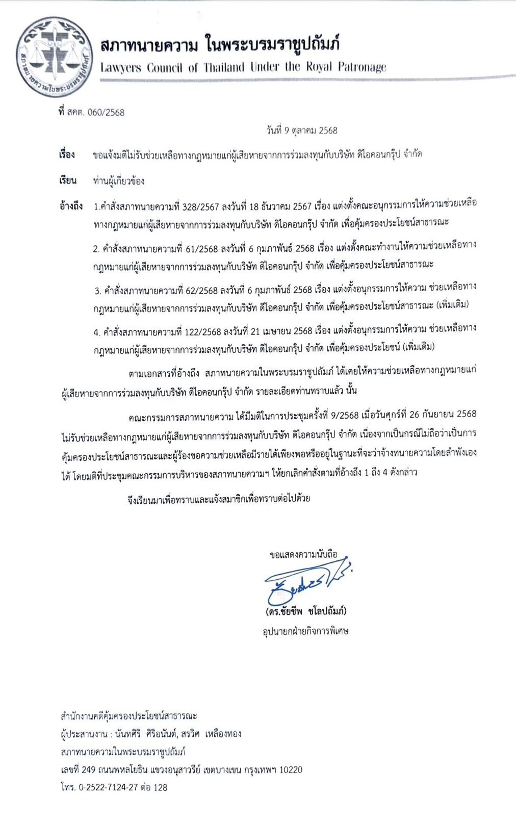 ถึงท่านผู้เกี่ยวข้องกับคดี ดิไอคอน ทางสภาทนายความไม่รับช่วยเหลือทางกฎหมาย ขอให้ผู้เสียหายพิจารณาด้วย เกิดอะไรขึ้น?