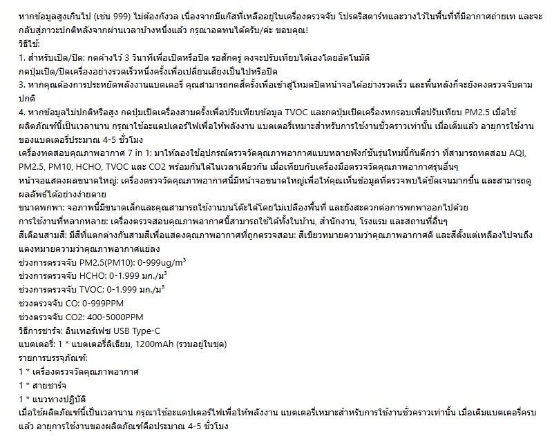 เครื่องตรวจจับนี้สามารถทดสอบ PM2.5, PM10, HCHO, TVOC, CO และ CO2 ได้(อ่านในรูปด้านล่าง)