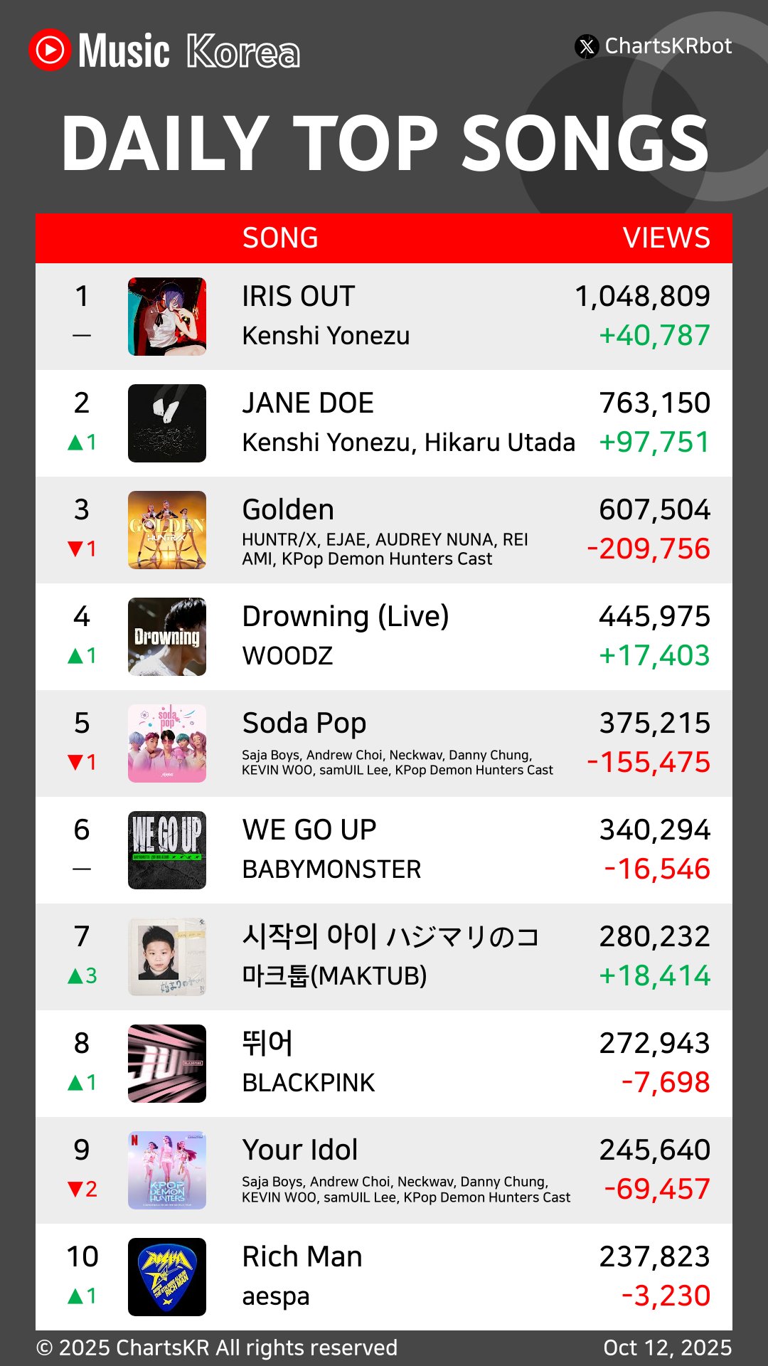 รายงานชาร์ตเพลง 5 ชาร์ต (13.10.2025) ****************** #HUNTR/X - Golden (OST.) #Kenshi Yonezu - IRIS OUT ******************. https://www.youtube.com/watch?v=yebNIHKAC4A #Melon