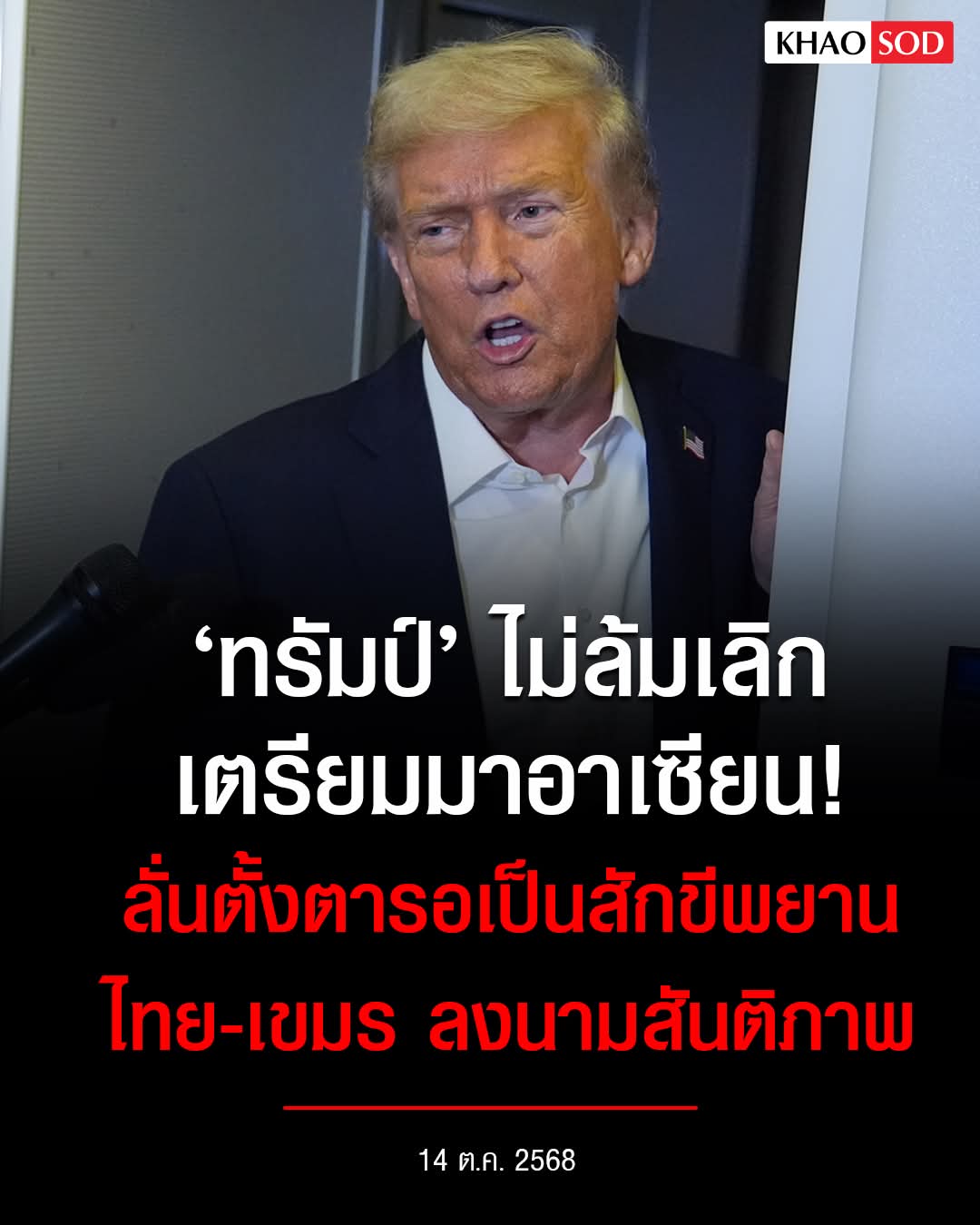 ทรัมป์ ไม่ล้มเลิกความตั้งใจ เตรียมมาประชุมอาเซียน รอเป็นสักขีพยาน ไทย-กัมพูชา ลงนามสันติภาพ แม้วืดโนเบลสันติภาพ