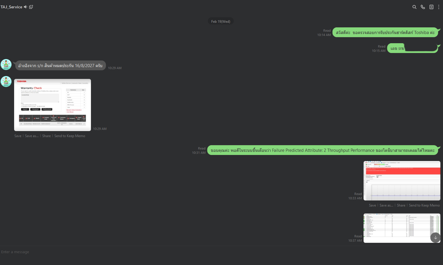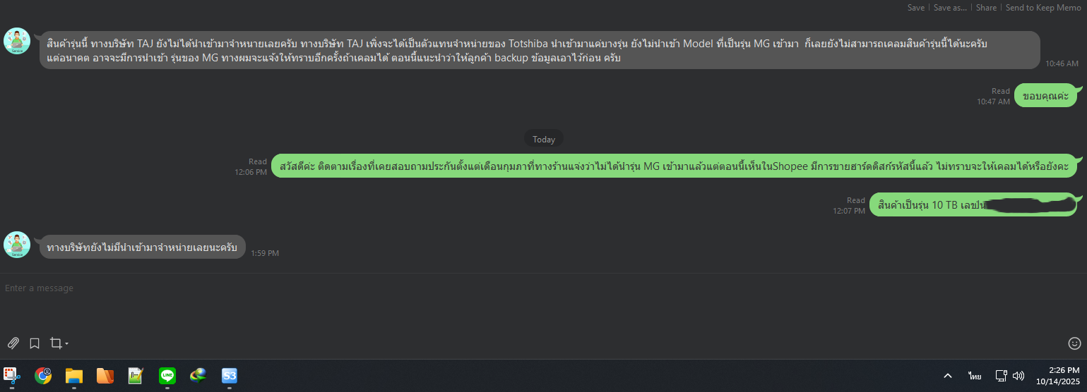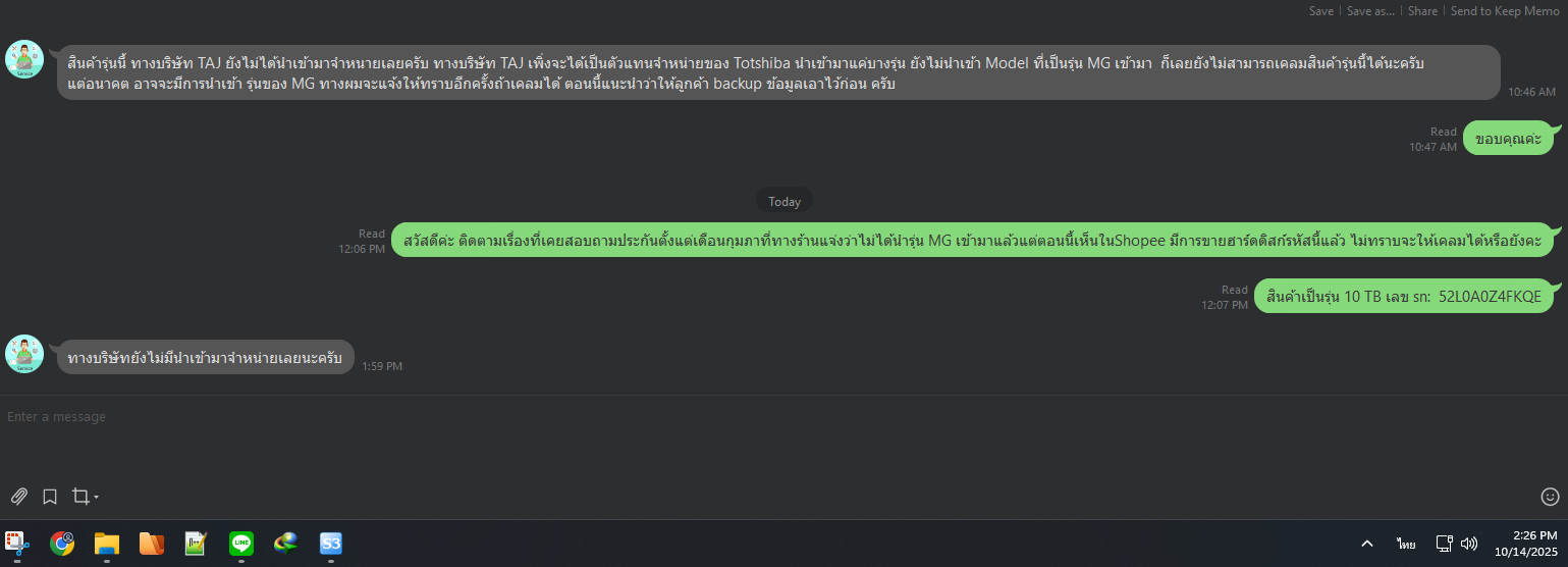 ติดต่อครั้งแรกไปวันที่ 19 ก.พ. 68 เราได้เริ่มติดต่อเคลม หลังจากระบบแจ้งเตือนว่า HDD ใกล้จะเสีย (Failure Predicted) ทางร้าน Official ให้ไปคุยกับฝ่ายเคลมโดยตรงในไลน์ แต่คำตอบที่ได้คือ "บริษัท (TAJ) ยังไม่ได้นำเข้ารุ่นนี้มาขาย เลยเคลมให้ไม่ได้ ให้รอไปก่อน ถ้าในอนาคตนำเข้ามาจะแจ้งอีกที"