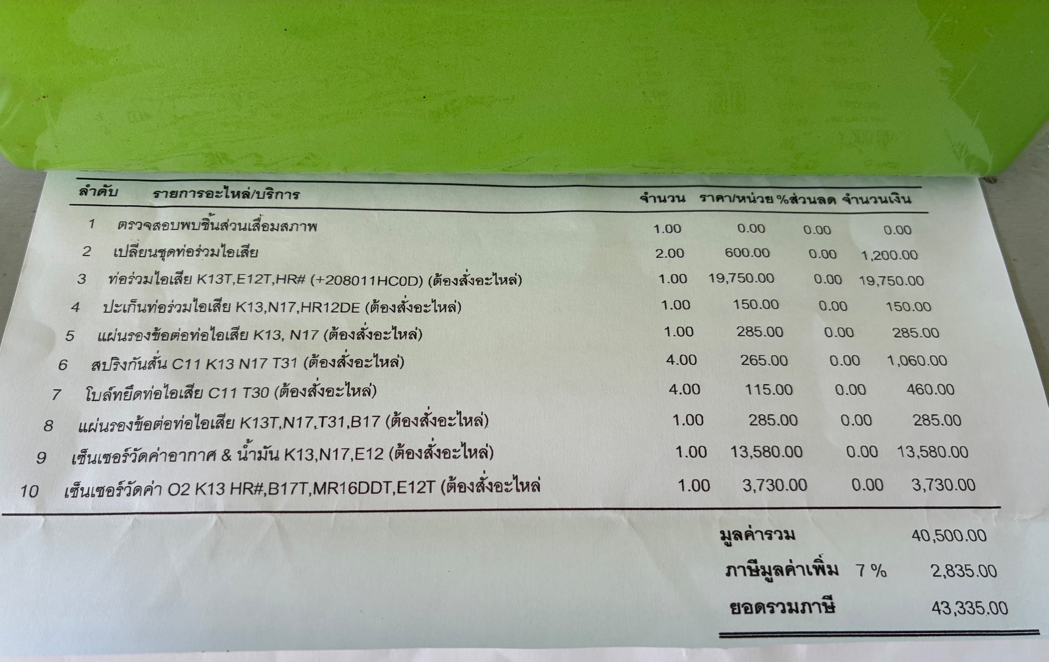 วันก่อนรถนิสสันอัลมีร่า 2012 ไฟเครื่องโชว์ ช่างตรวจบอกว่าแคทอุดตัน ทำใบเสนอราคา อยากทราบว่าตามนี้ใช่ไหมคะ รบกวนท่านผู้รู้ด้วยค่ะ ขอบคุณมากๆ🫶🙏