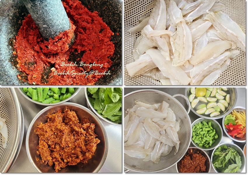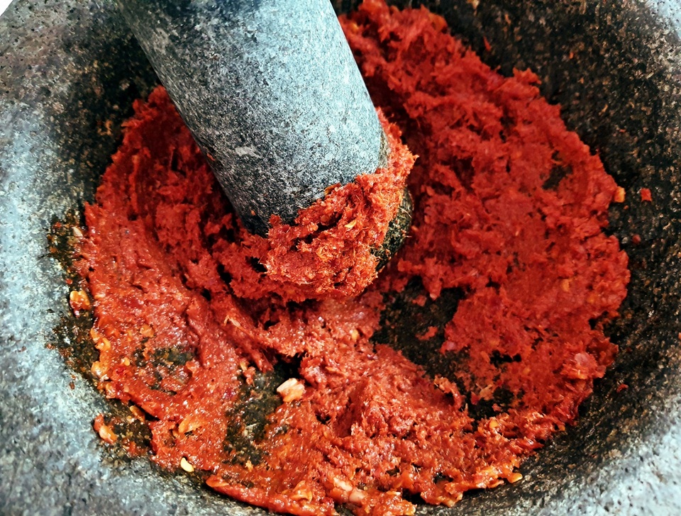 สุดท้ายใส่กะปิลงโขลกรวมให้เข้ากันดี เสร็จสิ้นการเตรียมพริกแกงป่าปลา