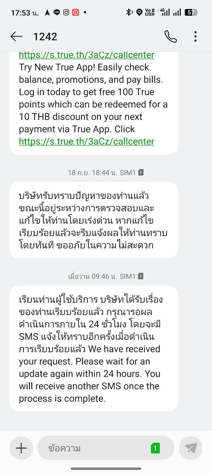 เนื่องจากเคยร้องเรียนไปยังกสทช.และสคบ.รวมไปถึงศูนย์รับเรื่องร้องเรียนของทรู ซึ่งก็ใช้ระยะเวลายาวนานพอสมควรร่วมเดือน และเมื่อได้ข้อยุติ true ก็ได้ส่ง SMS แจ้งมาตามที่แนบมานี้ว่าจะดำเนินการภายใน 24 ชั่วโมง