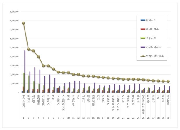ผลการวิเคราะห์ข้อมูลขนาดใหญ่ (Big Data) ของ "ชื่อเสียงแบรนด์วงไอดอล" ประจำเดือนตุลาคม 2025 โดยสถาบันวิจัยชื่อเสียงองค์กรแห่งเกาหลี (Korea Corporate Reputation Research Institute) พบว่า BTS คว้าอันดับ 1 ตามมาด้วย IVE อันดับ 2 และ SEVENTEEN อันดับ 3