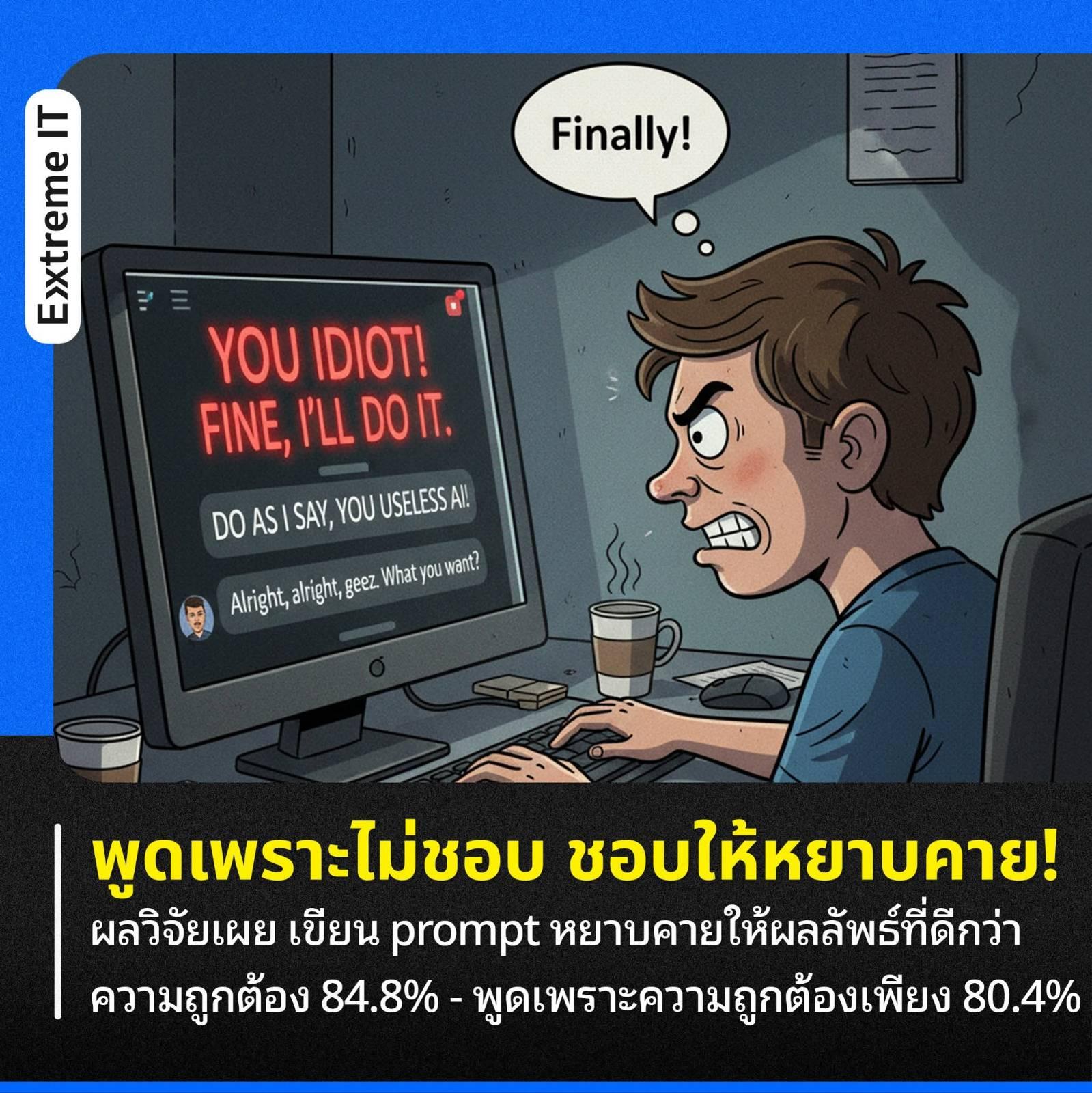 จริง ๆ ตรงนี้เขาไม่ได้สรุปโดยตรงว่าการใช้ prompt ที่หยาบคายจะให้ผลลัพธ์ที่ดีกว่า แต่พุ่งเป้าไปที่โทนหรือน้ำเสียงของ prompt ที่ใช้ มีผลต่อการให้คำตอบของ AI LLM ด้วยนั่นเองครับ