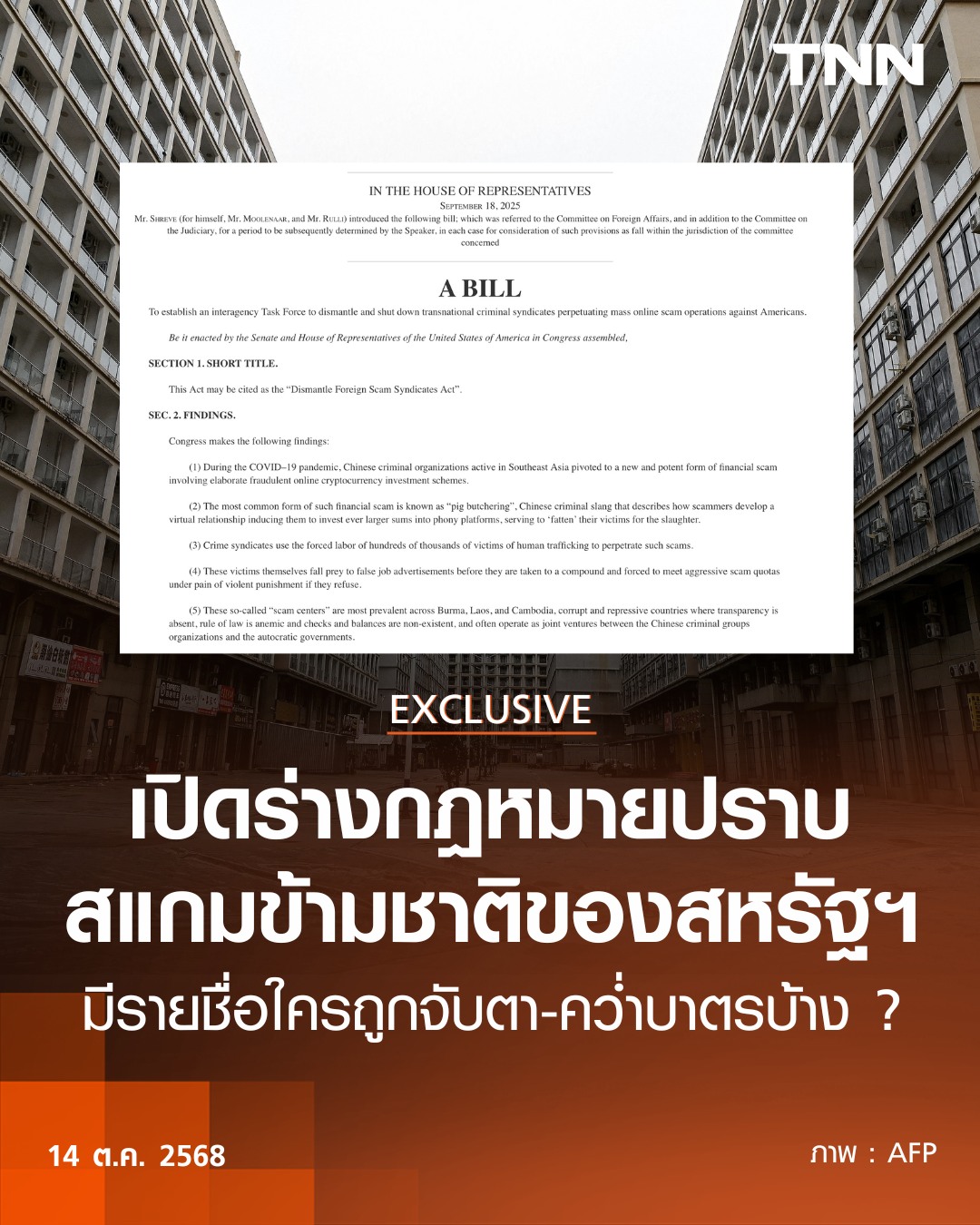 สหรัฐฯ เสนอร่างกฎหมาย “Dismantle Foreign Scam Syndicates Act” เพื่อจัดการกลุ่มสแกมข้ามชาติในเอเชียตะวันออกเฉียงใต้ หลังพบความเสียหายกว่า 10,000 ล้านดอลลาร์ในปีเดียว ร่างกฎหมายชี้เป้าศูนย์สแกมใน พม่า ลาว กัมพูชา และระบุชื่อบุคคล-บริษัทที่ถูกคว่ำบาตรและจับตา