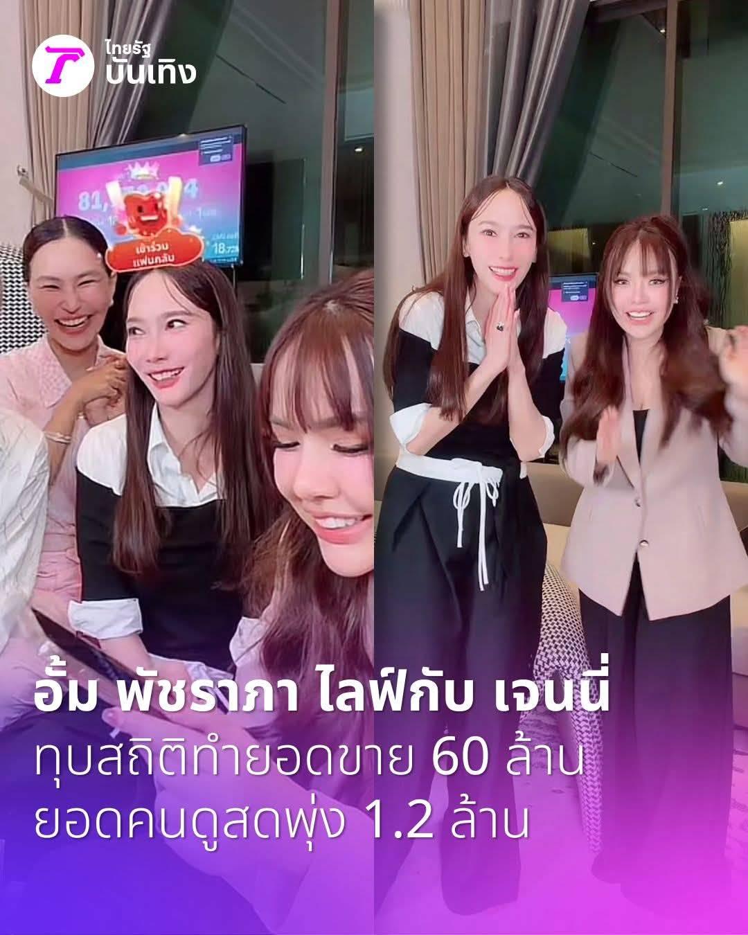 สุดปัง! อั้ม พัชราภา ไลฟ์กับ เจนนี่ ได้หมดถ้าสดชื่น ทุบสถิติทำถึง 60 ล้านบาท และ ยอดรวม 77ล้านบาท ยอดคนดูสดพุ่งถึง 1.2 ล้านคน สมศักดิ์ศรีนางเอกเบอร์ 1 ตลอดกาลของเมืองไทย