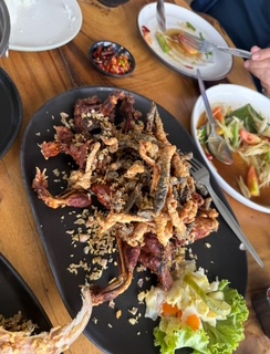 ผู้รู้บอกว่ามาเมืองกาญจน์มีอาหารขึ้นชื่อคือกบตัวใหญ่ ฉะนั้นเราจึงสั่งกบกระเทียมในเมนู เพราะมนุษย์ป้าทั้งสามล้วนมีรสนิยมวิไลในการกิน วาดภาพกบกระเทียมเป็นขากบอบเนยกระเทียมตามแบบ ร้าน La Grenouille ที่ปารีส จึงแป่ววว์ เป็นครั้งที่สอง เพราะกบกระเทียมที่ได้มาคือ กบตัวใหญ่ขนาดลูกแมวแรกคลอด ทอดกรอบโรยกระเทียมเจียวสองกำ มือ! แต่ก็อร่อยดีจึงไม่ว่ากัน
